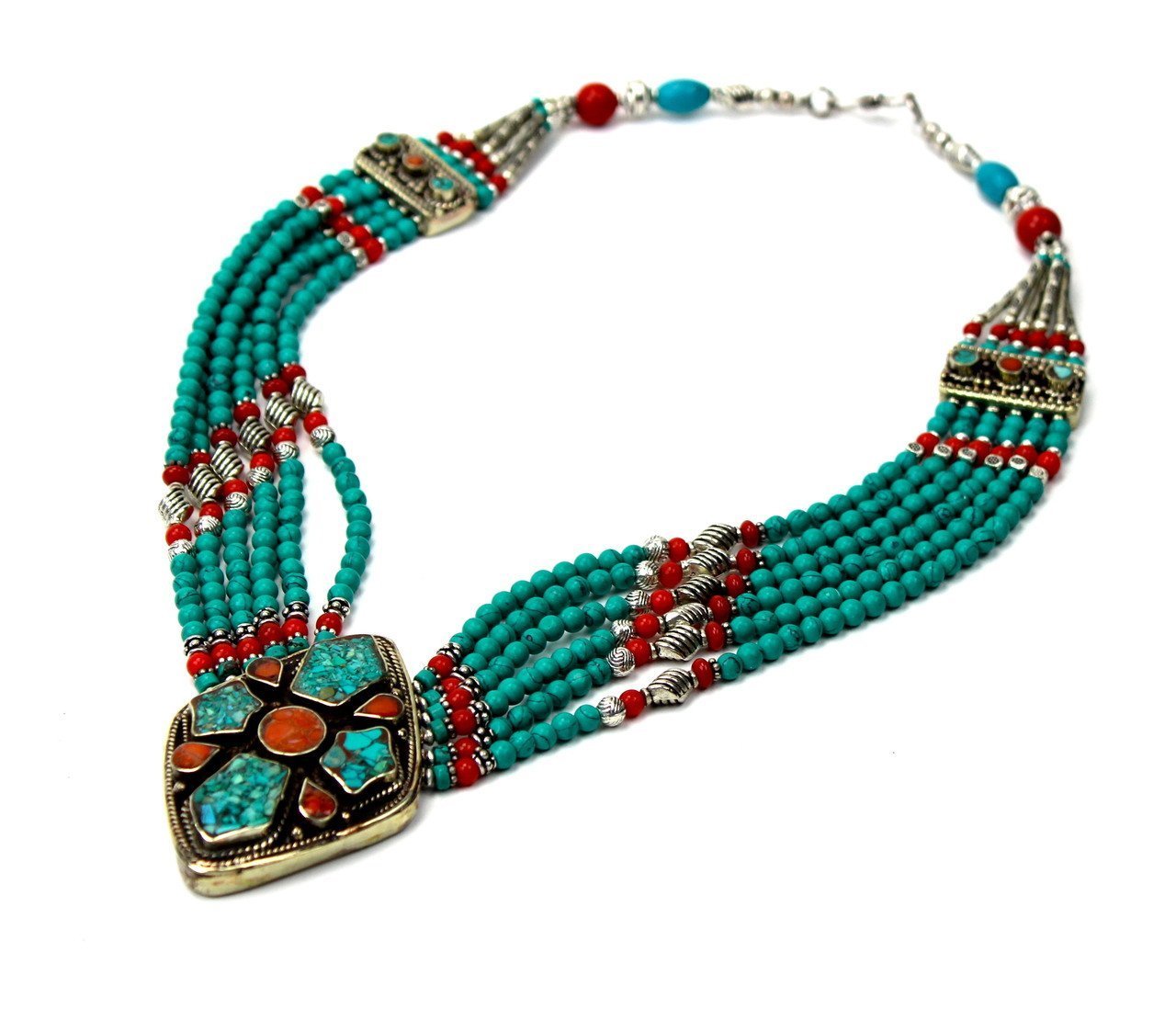 Las mujeres tibetanas siempre han usado cuentas grandes y atrevidas. Este hermoso collar tibetano está hecho a mano con turquesas, corales y cuentas de latón y plata. Seis hebras de cuentas de turquesa y coral de 6 mm sostienen un colgante grande y atrevido de plata, turquesa y coral en el centro. Presenta cierre en "S".