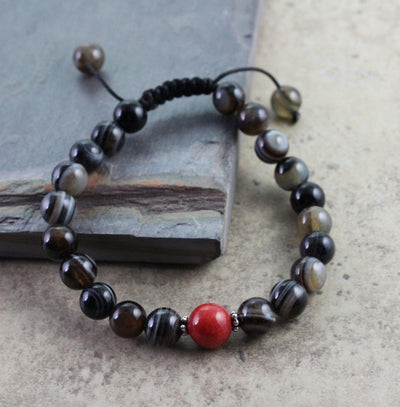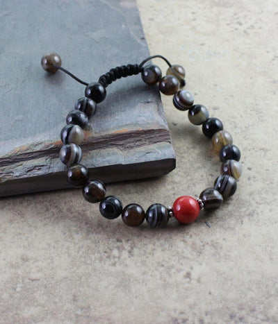 Estas verdaderas cuentas de ágata rayada tienen diseños hermosos y únicos. Estas cuentas son difíciles de encontrar en Nepal. Este mala de muñeca cuenta con un espaciador de jade de montaña rojo y es totalmente ajustable.