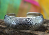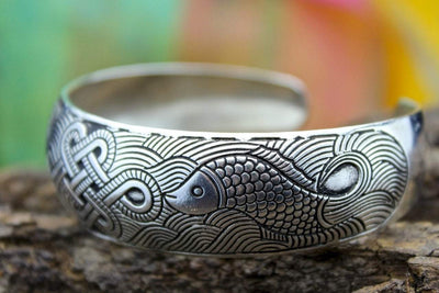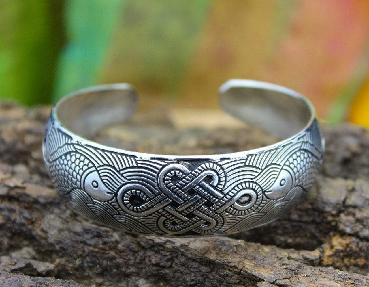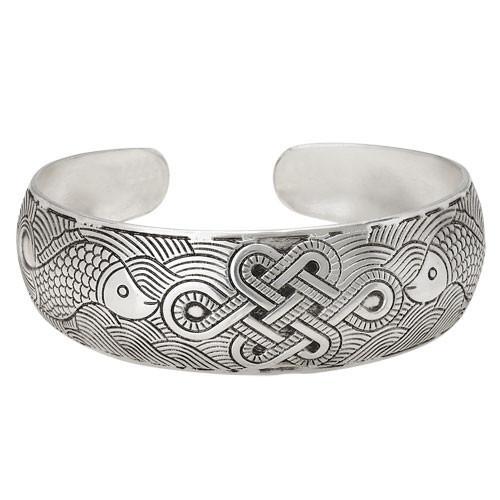 Dos símbolos auspiciosos se unen en esta llamativa pulsera tipo brazalete. El nudo eterno representa la interconexión de la sabiduría y la compasión. Los peces representan la valentía mientras nadan en el océano sin miedo a ahogarse.