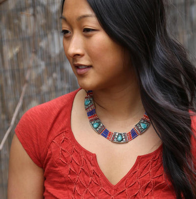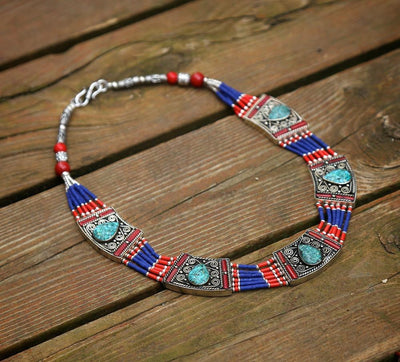 Un diseño único y sorprendente con cuentas tibetanas con incrustaciones de coral y turquesa. Me encantan las piedras turquesas incrustadas a mano.
