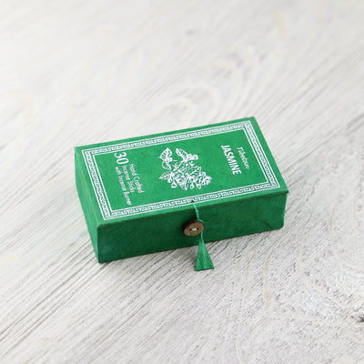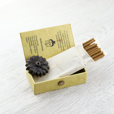 El incienso viene en una caja de papel lokta hecha a mano. El papel Lokta es elaborado íntegramente por una comunidad cooperativa de mujeres local de Katmandú involucrada en el tratamiento ecológico y la preservación del bosque. Esta forma de producción de papel es sostenible y respetuosa con el medio ambiente.