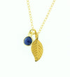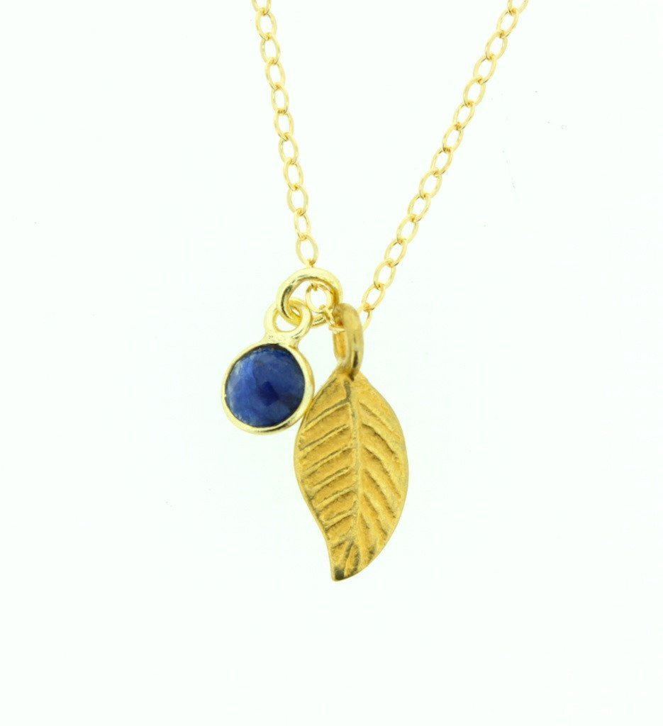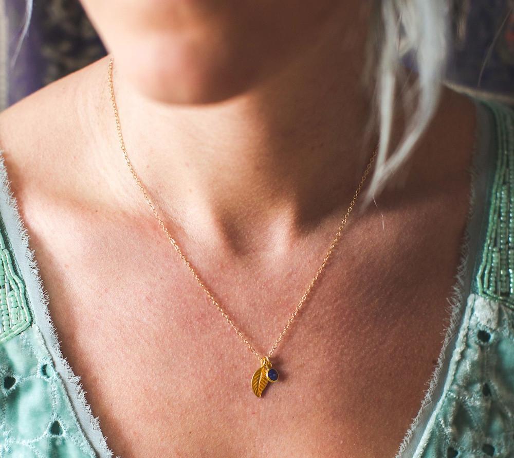 Un nuevo y sorprendente collar de oro vermeil. Un colgante de plumas de 1 pulgada con un dije de lapislázuli facetado de 6 mm está colgado de una cadena plana llena de oro.