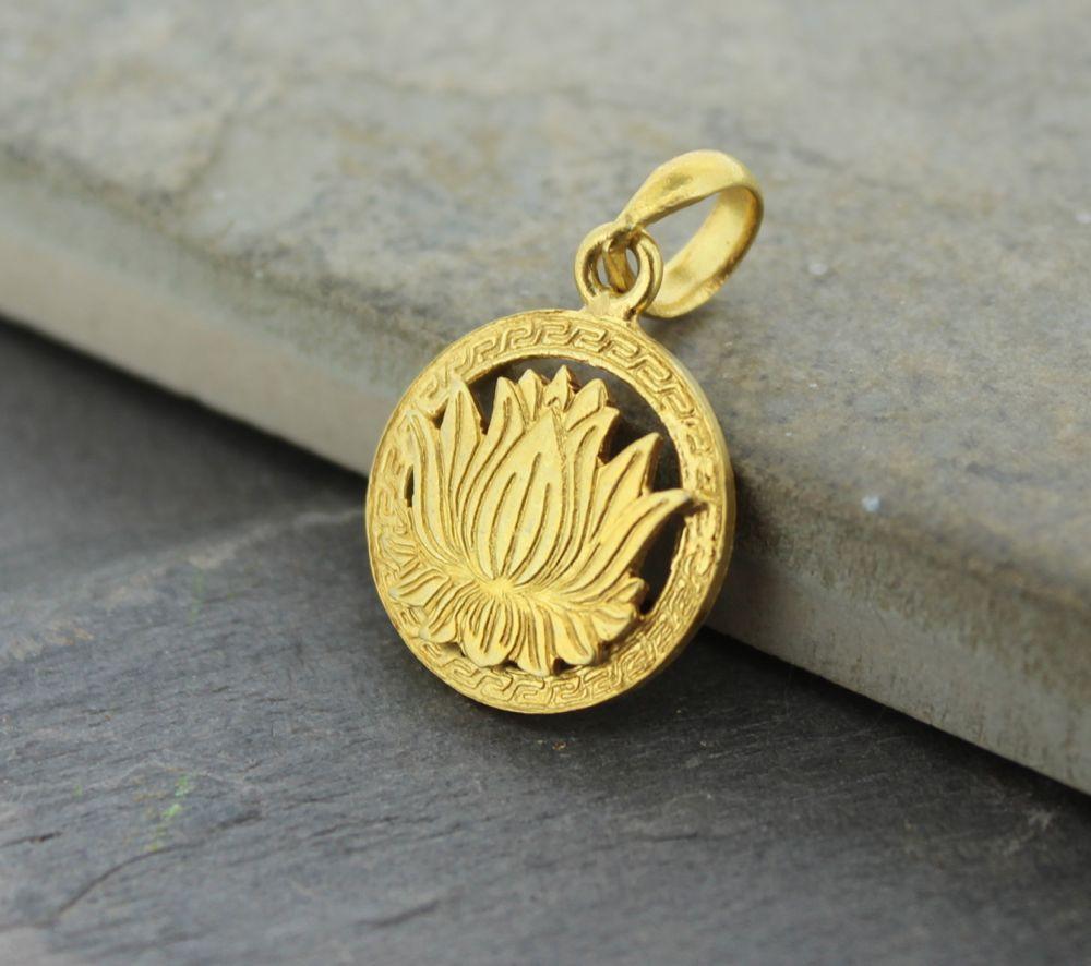 Un colgante de plata de ley bañado en oro de 24k hecho a mano en Katmandú, Nepal.