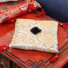 Un gran cojín para sentarse en tazones de tamaño mediano. Confeccionado en poliéster color marfil, presenta un hermoso diseño de brocado dorado con borlas rojas en cada extremo y una borla negra en el centro. Fabricado en Nepal.