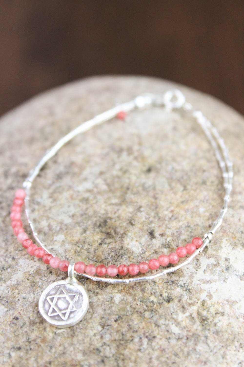 Estas delicadas y elegantes pulseras lucen preciosas tanto solas como combinadas. Hechos con un 98 % de plata pura de las tribus de las colinas, incluyen cuentas de cuarzo rosa multicolor y cuentan con un lindo dije de estrella de David de plata estampado a mano.