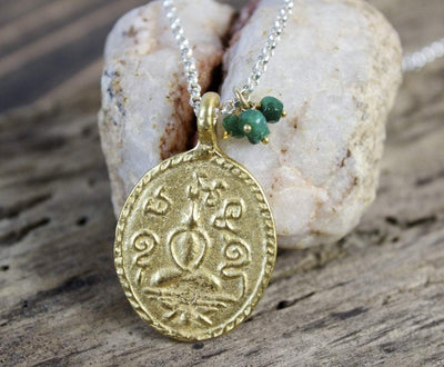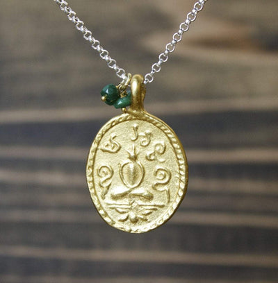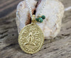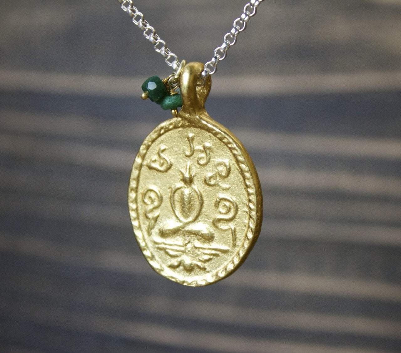 Cadena rolo de plata de ley con colgante de oración tailandés vermeil mate y cuentas de aventurina. Colgante de aproximadamente 1 pulgada de largo. Cadena de 24 pulgadas.