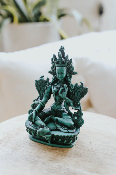 A Tara Verde se le conoce como el Buda de la actividad iluminada, lleno de vigor juvenil. Ella es la forma más feroz de Tara, pero sigue siendo una diosa salvadora de la compasión. Green Tara es intensamente compasiva y actúa rápidamente para ayudar a quienes la invocan.