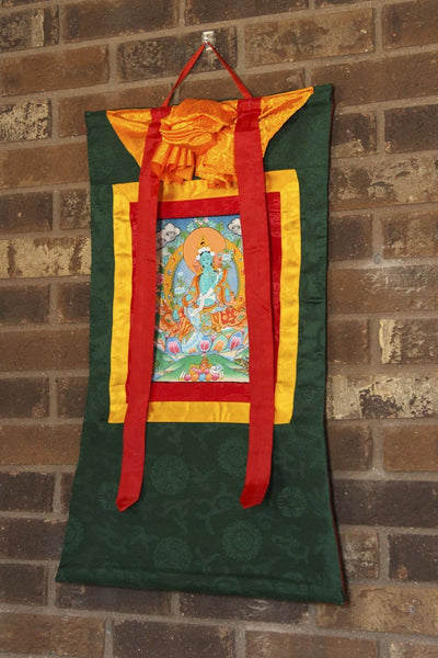 Una impresionante Tara Thangka verde pintada a mano con detalles dorados. Nuestros thangkas están pintados a mano por maestros artistas y sus aprendices. Las escuelas Thangka en Nepal ayudan a mantener vivas las tradiciones tibetanas.