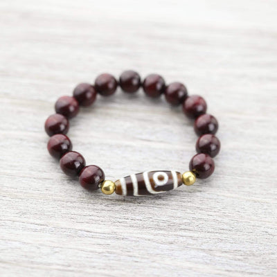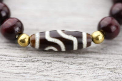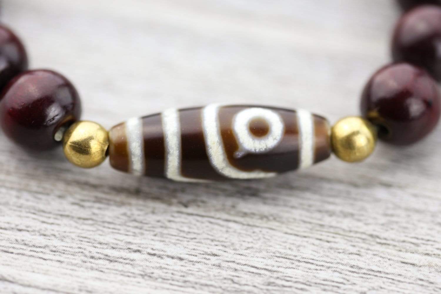 Se dice que la cuenta Dzi de dos ojos promueve la riqueza, la buena salud, el éxito, la compasión y la gloria. Es importante para mejorar la estabilidad y la unión, y genera buena energía en la construcción de relaciones con las personas. Se cree que este Dzi es bueno para el equilibrio en la vida.