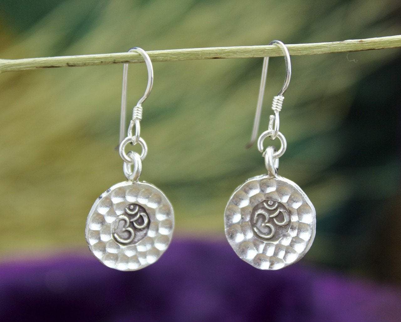 Estos sencillos aretes Om de plata tailandesa de uso diario están martillados a mano con ganchos franceses de plata esterlina.