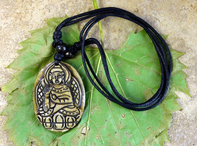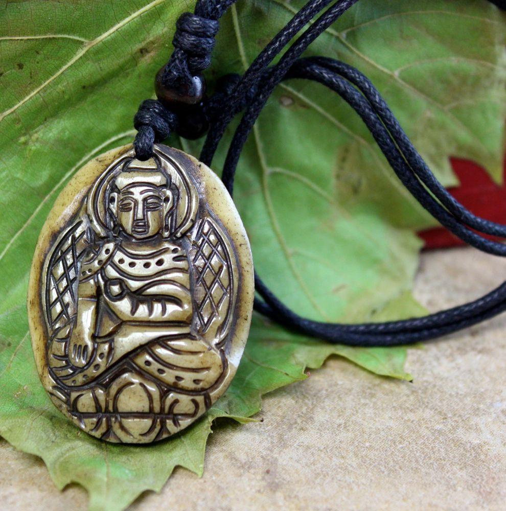 Una mano de Buda grande y genial tallada en hueso de yak y ensartada en un collar ajustable de cordón de algodón encerado.
