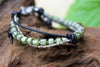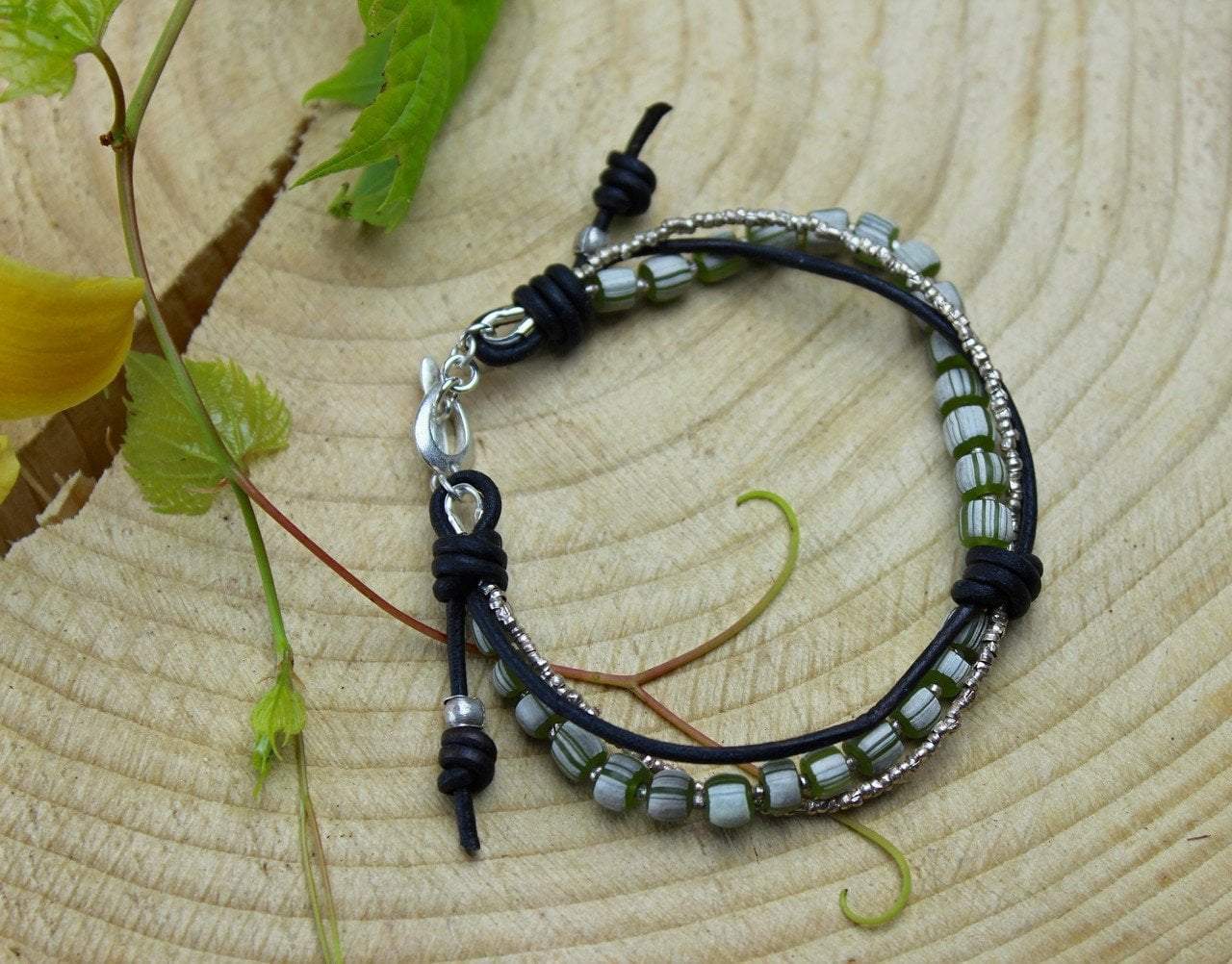 ¡Tenemos una cantidad extremadamente limitada de estas pulseras! Impresionantes cuentas de vidrio reciclado pintadas a mano se complementan con plata tailandesa y cuero. Cierre de palanca de plata de primera ley.