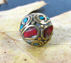 Otra hermosa cuenta de Katmandú Nepal. Latón con incrustaciones de turquesa y coral.