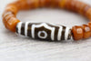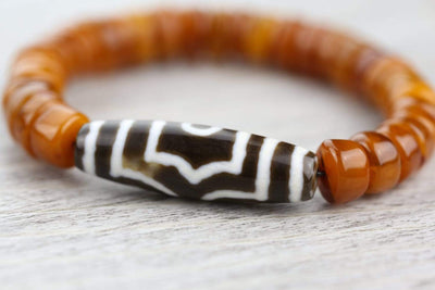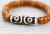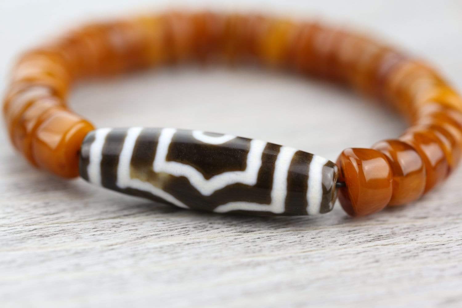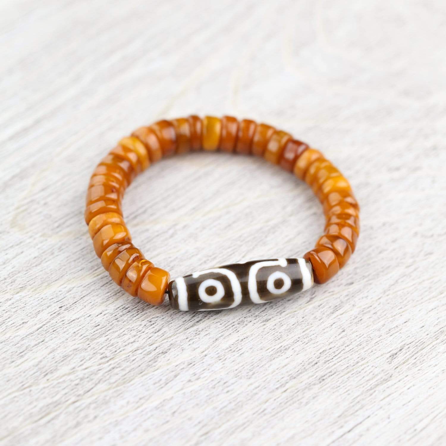 La pulsera mide aproximadamente 7 pulgadas de diámetro con cordón elástico. Las cuentas son discos de 10-12 mm. Dzi mide poco más de 1,5 pulgadas de largo y 0,5 pulgadas de ancho. ¡Encordado a mano en DharmaShop!