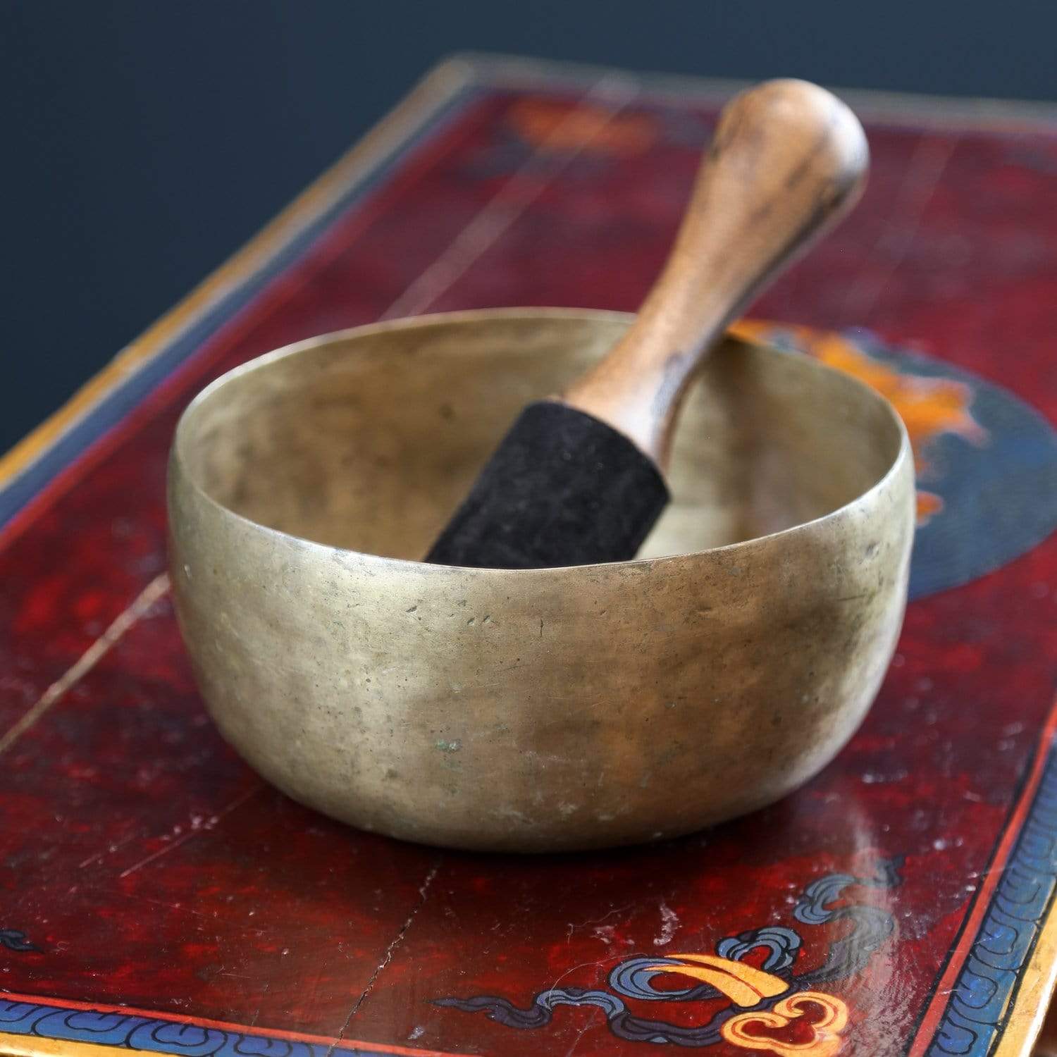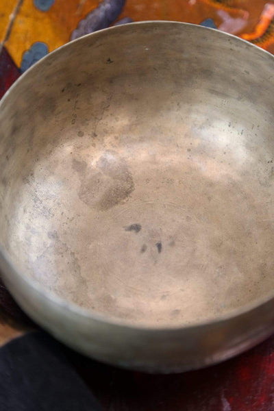 En su último viaje a Nepal en 2019, Sander pudo tocar cientos de bolos antiguos de esta colección. Seleccionó cuidadosamente sólo unas pocas docenas de cuencos, incluido éste, por su sonido de alta calidad y características físicas únicas.
