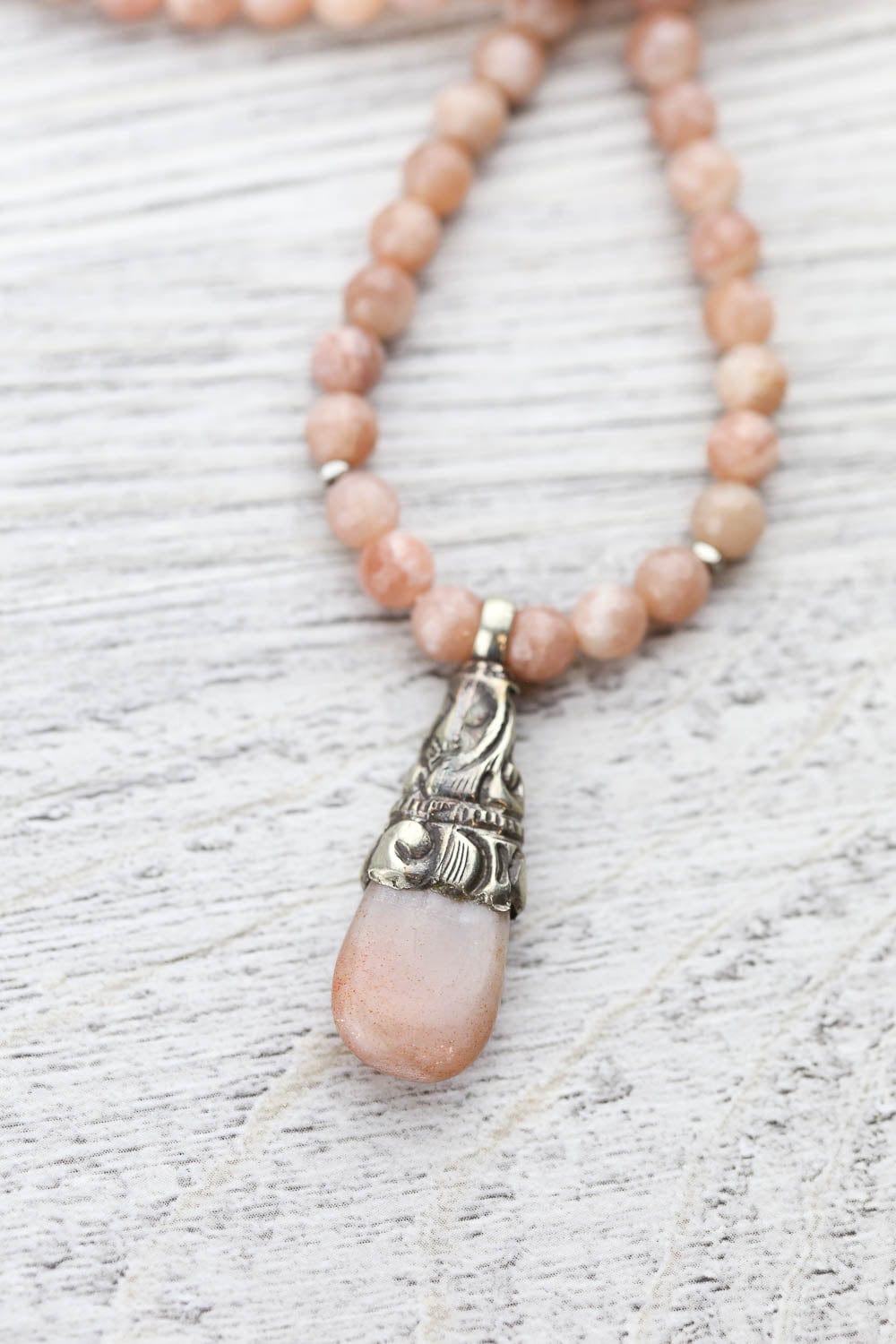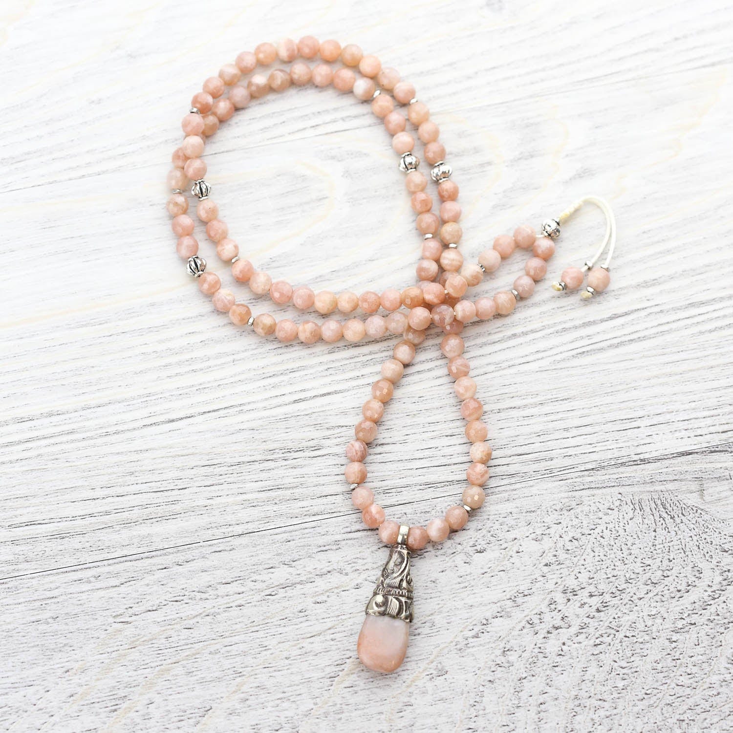Mala mide aproximadamente 27 pulgadas de diámetro con un nudo ajustable. Las cuentas son de 6 mm. El colgante mide aproximadamente 1,5-2 pulgadas.