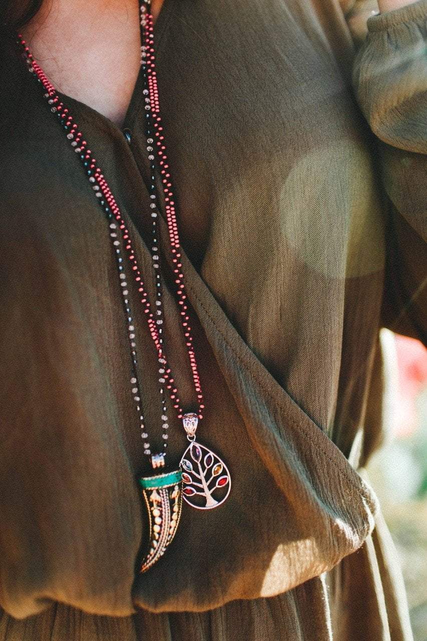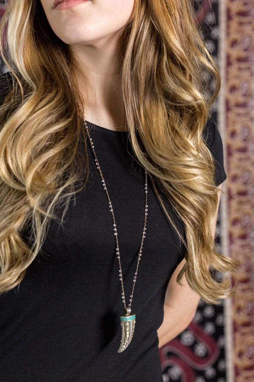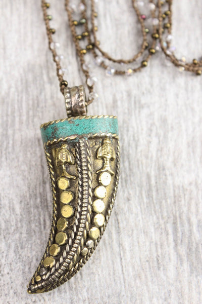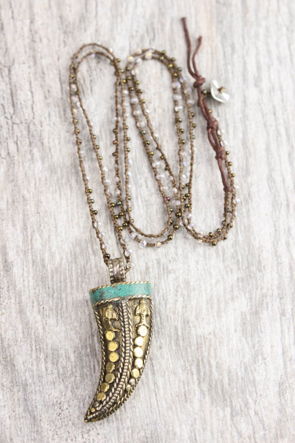 Nuestro nuevo colgante de cuerno tibetano viene combinado con una cadena de piedras preciosas tejida a mano. El cuerno es vegano y está hecho de piedra con incrustaciones de plata, turquesa y detalles de latón.