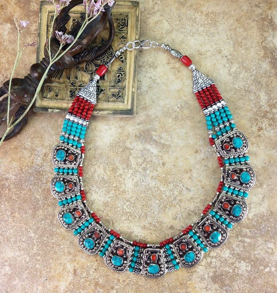 Karma Dolma lleva casi 10 años creando impresionantes diseños de joyería para nosotros. Su nuevo diseño evoca la joyería tradicional tibetana y al mismo tiempo encaja bien con la moda actual. Esta pieza presenta hermosas piedras de turquesa y coral incrustadas a mano en cuentas tibetanas de latón plateado.