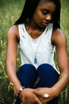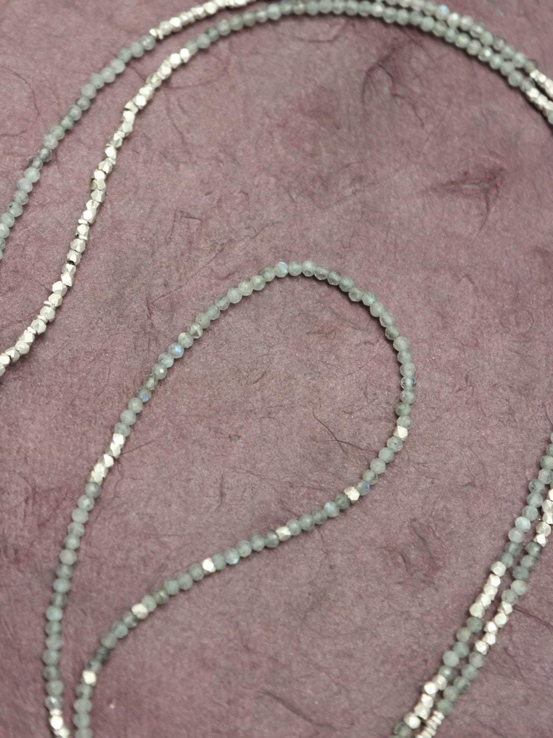 Se cree que la labradorita abre al usuario a su intuición natural y su espíritu creativo. Su belleza y color en capas provienen de miles de años de placas minerales que se deslizan entre sí, apilándose unas encima de otras para crear muchas líneas y vetas de colores profundas en la piedra. Es una piedra de los Chakras del Corazón y de la Garganta.