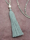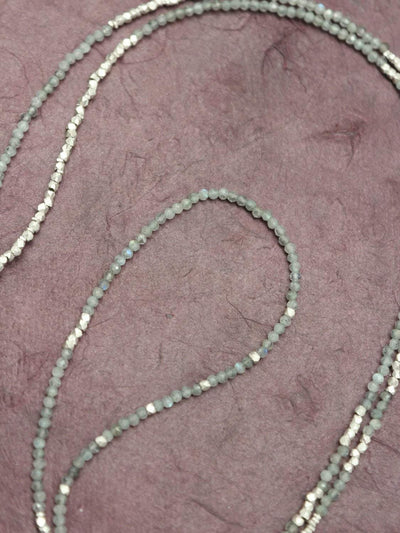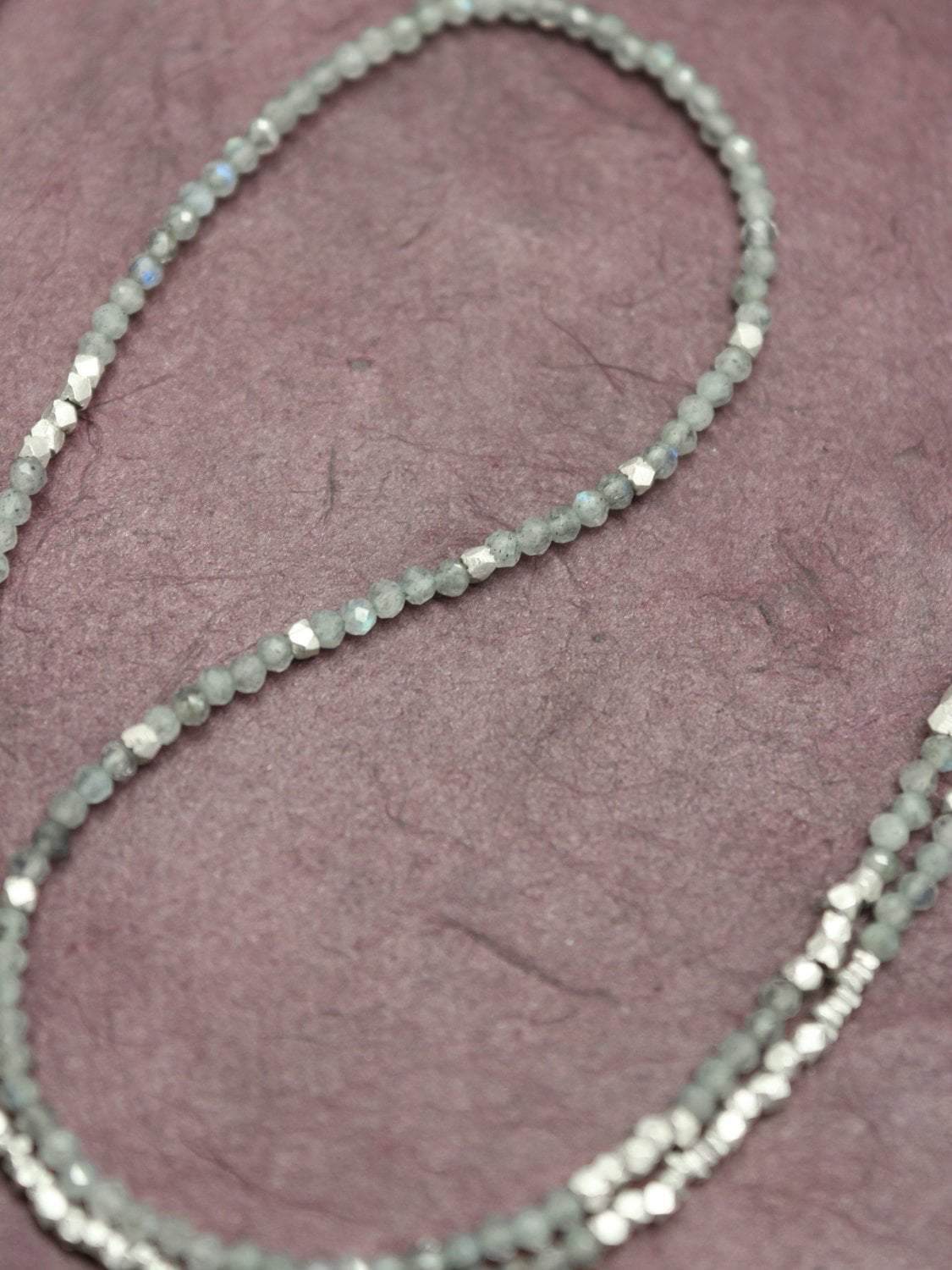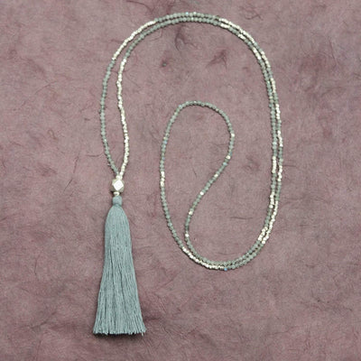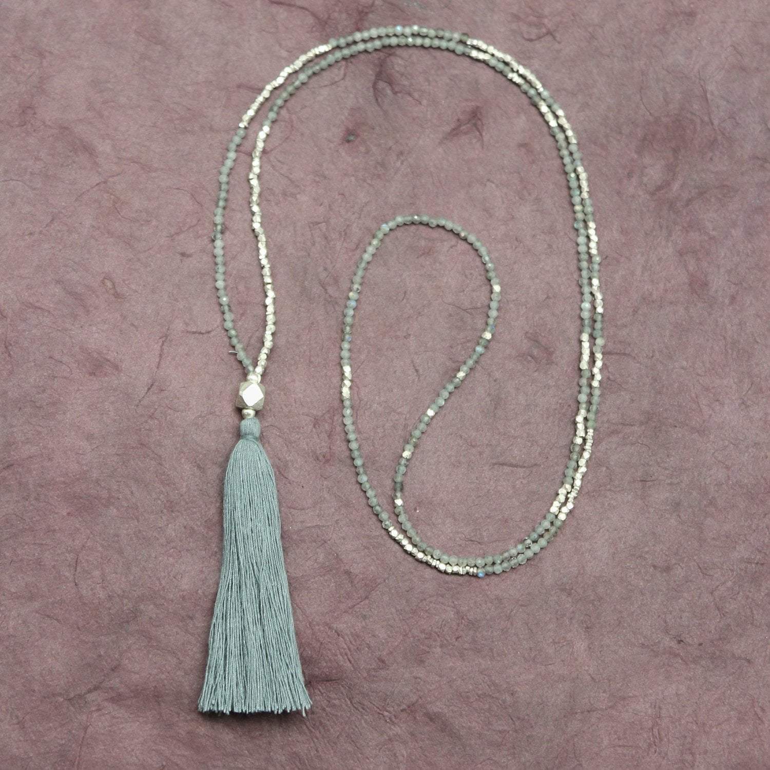 Hermoso y delicado collar hecho a mano con pequeñas piedras preciosas de labradorita y cuentas de plata 98% pura de las tribus de las colinas de Tailandia. Acabado con una preciosa borla azul acero. ¡Este collar es simplemente impresionante! Es el regalo perfecto para ti o para alguien especial.