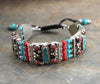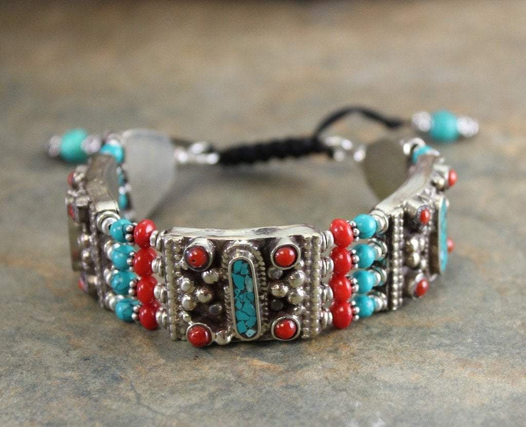 Hermosas y tradicionales, las cuentas tibetanas están unidas con un nudo ajustable para caber sobre su muñeca. Incrustaciones de cuentas de turquesa y coral en latón plateado.