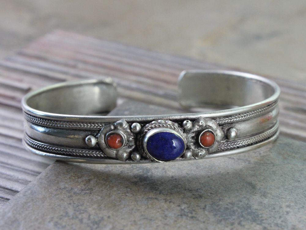 Ha sido difícil mantener existencias de pulseras este año, todos nuestros clientes han estado pidiendo más. Estas económicas pulseras plateadas tienen 1 piedra de lapislázuli y dos pequeños corales engastados en un estilo tradicional tibetano.