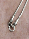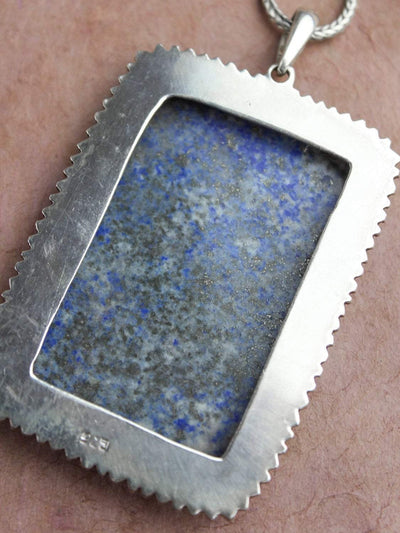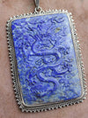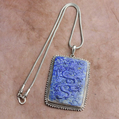 Este hermoso y único collar con colgante presenta un diseño de dragón intrincadamente tallado en un colgante de piedra preciosa de lapislázuli. El lapislázuli de alta calidad puede contener algo de pirita esparcida de forma atractiva por toda la gema, y esto es visible en todo el colgante. Cuelga de una cadena tejida de plata de ley y su engarce de plata de ley incluye un hermoso detalle de cuerda.