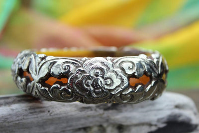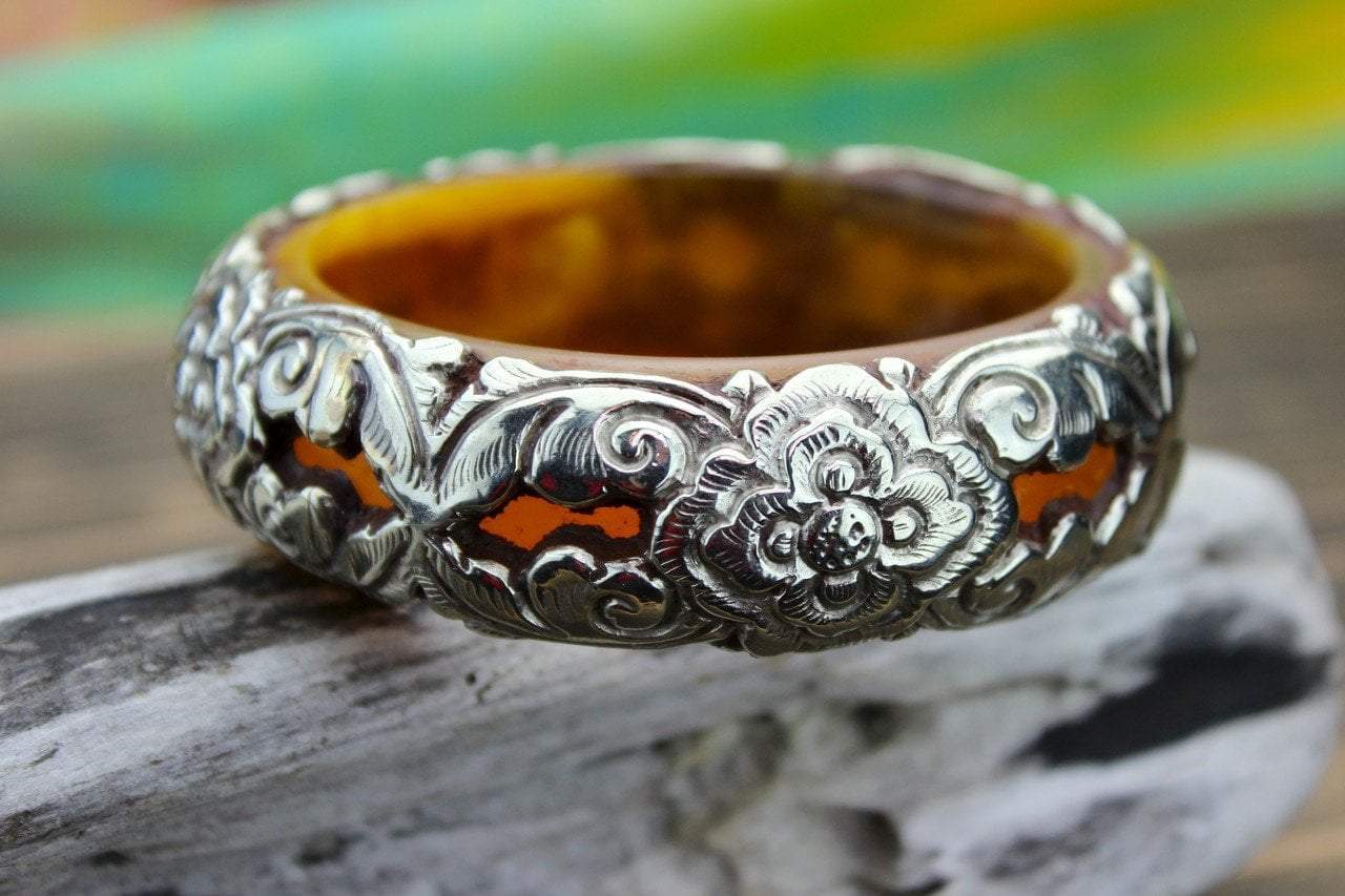 Esta es una pulsera de copal (ámbar nuevo, hecho de resinas de árboles naturales) única en su tipo con diseños tallados a mano en plata. Un estilo tradicional comprado directamente a artesanos tibetanos en Katmandú.