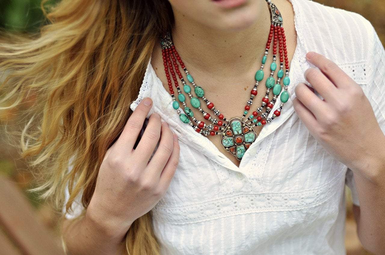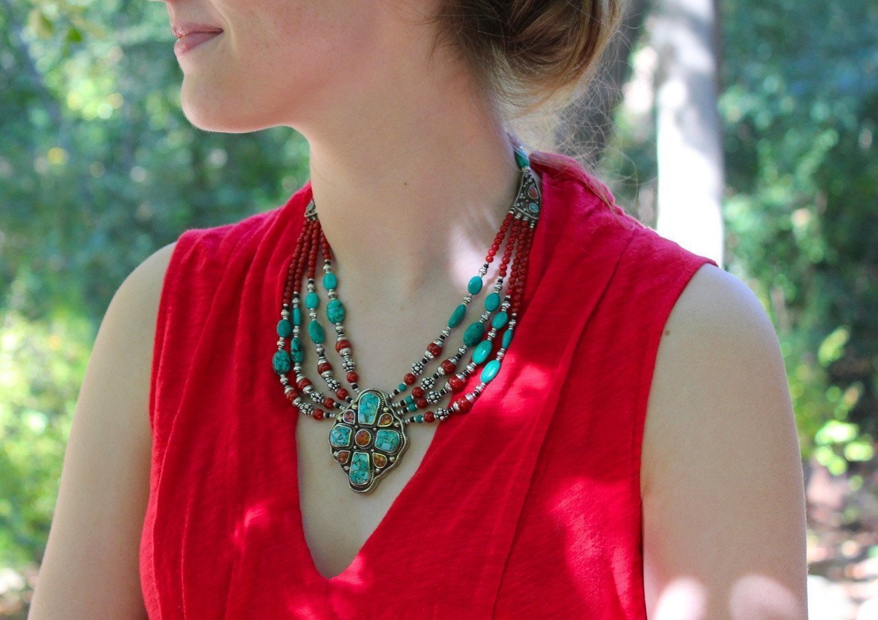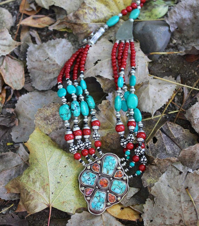 Otro sorprendente collar tradicional creado por Karma Dolma en Katmandú, Nepal. Hebras de cuentas de turquesa y coral conducen a una cuenta focal tibetana tradicional plateada y turquesa.