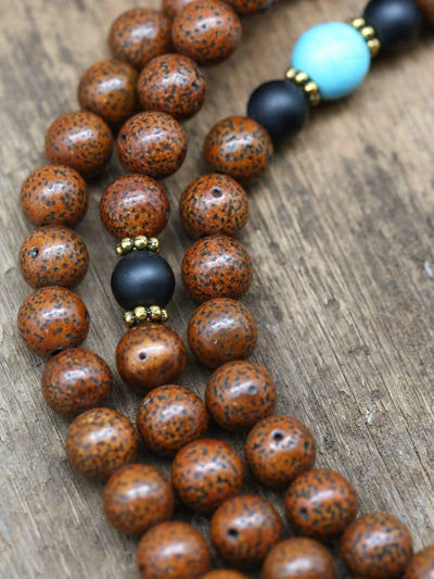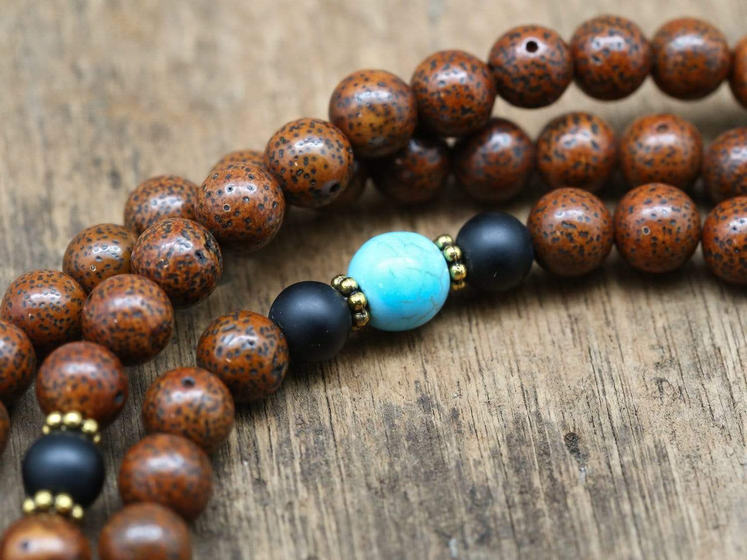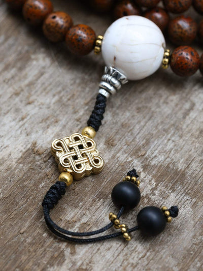 El fundador de DharmaShop, Sander Cohen, ayudó a diseñar este mala de 108 cuentas junto con nuestros artesanos en Katmandú. Está hecho con cuentas de semillas de loto pulidas de alta calidad, una cuenta marcadora de howlita azul, espaciadores de ónix mate y una cuenta de gurú de concha de naga. Un colgante de Nudo Eterno chapado en oro remata la mala. De hecho, Sander adquirió estos increíbles colgantes en su último viaje a Taiwán y los llevó directamente a nuestro fabricante de mala en Nepal, ¡lo que convierte a este en un diseño verdaderamente exclusivo de DharmaShop!