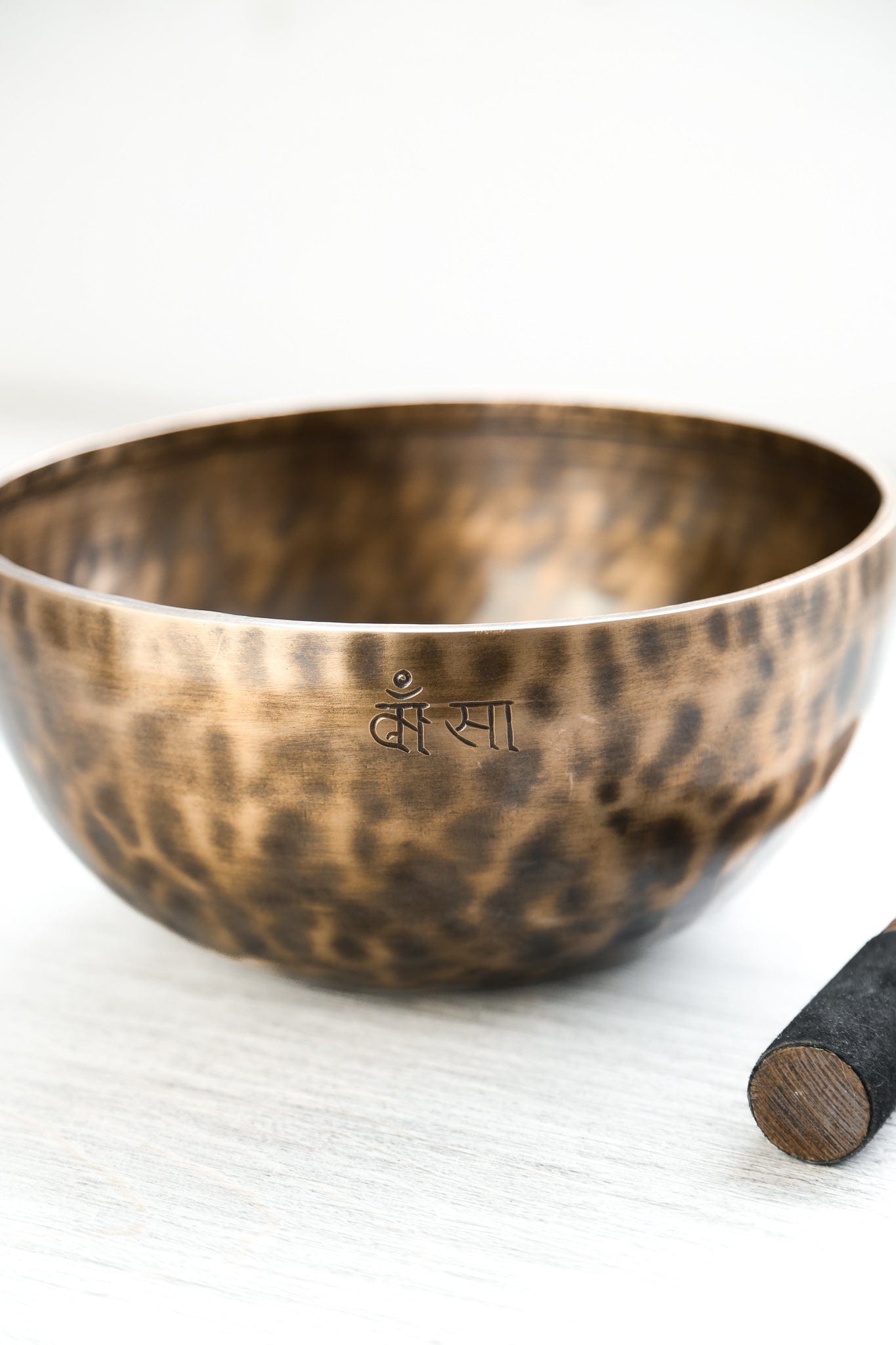 This bowl rings at a grounding Root Chakra C note (~256–265 Hz) when struck with a woolen mallet. Known for its calming and stabilizing effects, C supports deep relaxation and anchors the body in the present moment—ideal for stress relief and nervous system regulation.