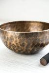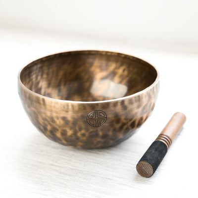 Each bowl features gorgeous hand carved details including an exclusive Full Moon Singing Bowl stamp and the mantra of compassion in Tibetan script. The mantra invokes the powerful benevolent attention and blessings of Chenrezig, the embodiment of compassion. The Full Moon Singing Bowl stamp is also known as a symbol of longevity and happiness.