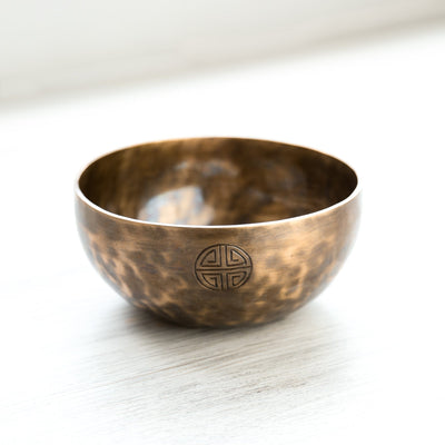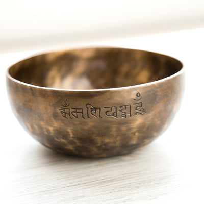 Each bowl features gorgeous hand carved details including an exclusive Full Moon Singing Bowl stamp and the mantra of compassion in Tibetan script. The mantra invokes the powerful benevolent attention and blessings of Chenrezig, the embodiment of compassion. The Full Moon Singing Bowl stamp is also known as a symbol of longevity and happiness.