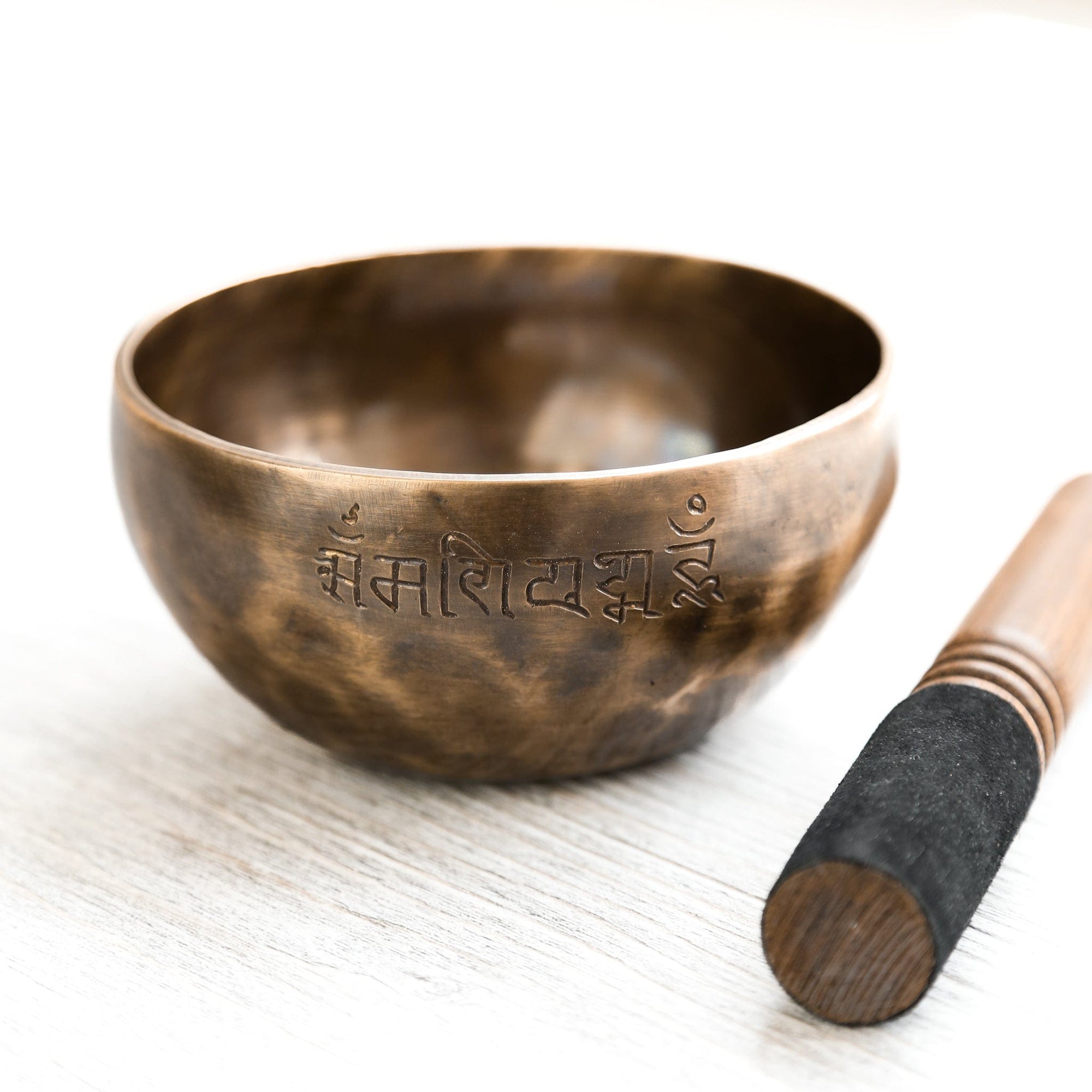 Each bowl features gorgeous hand carved details including an exclusive Full Moon Singing Bowl stamp and the mantra of compassion in Tibetan script. The mantra invokes the powerful benevolent attention and blessings of Chenrezig, the embodiment of compassion. The Full Moon Singing Bowl stamp is also known as a symbol of longevity and happiness.