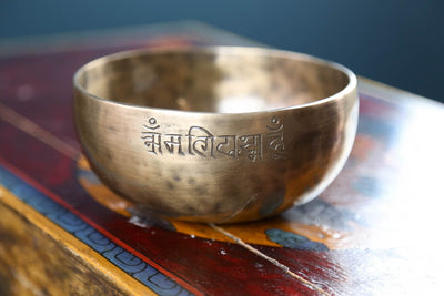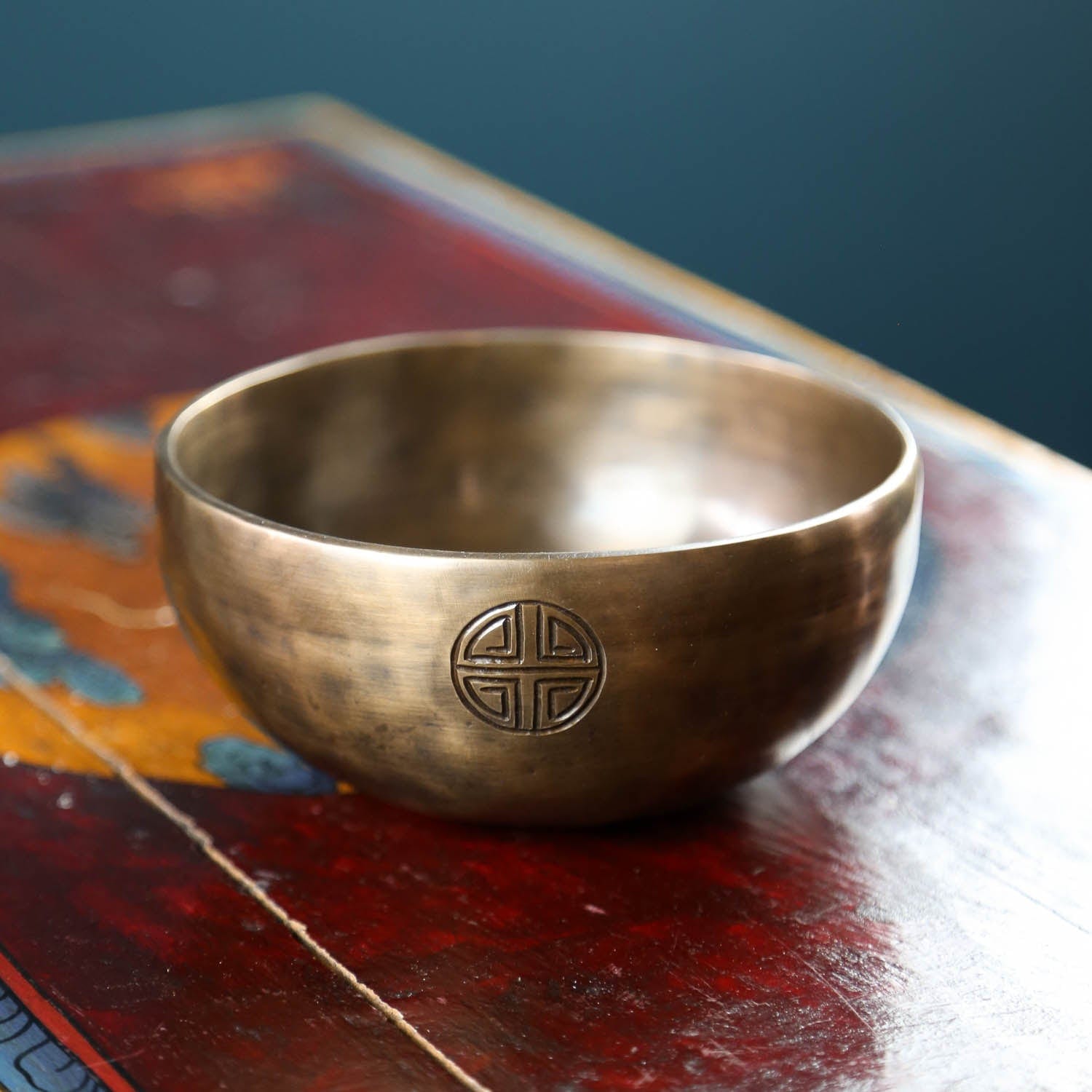 Cada cuenco presenta magníficos detalles tallados a mano, incluido un sello exclusivo de cuenco tibetano de luna llena y el mantra de la compasión en escritura tibetana. El mantra invoca la poderosa atención benévola y las bendiciones de Chenrezig, la encarnación de la compasión. El sello del cuenco tibetano de luna llena también se conoce como símbolo de longevidad y felicidad.