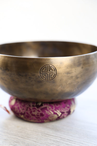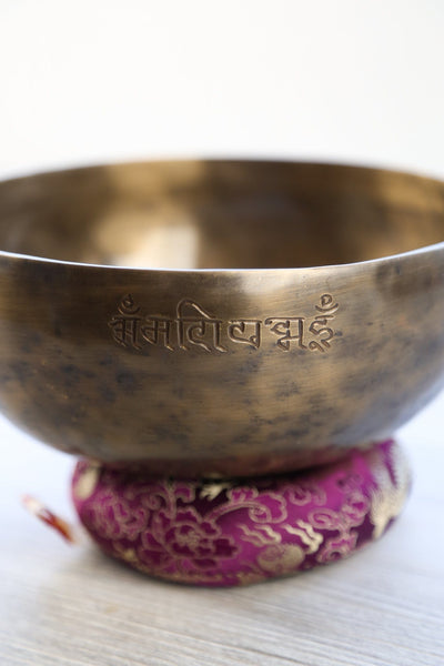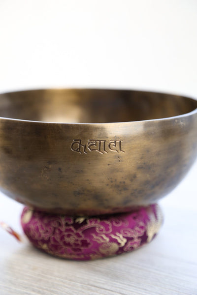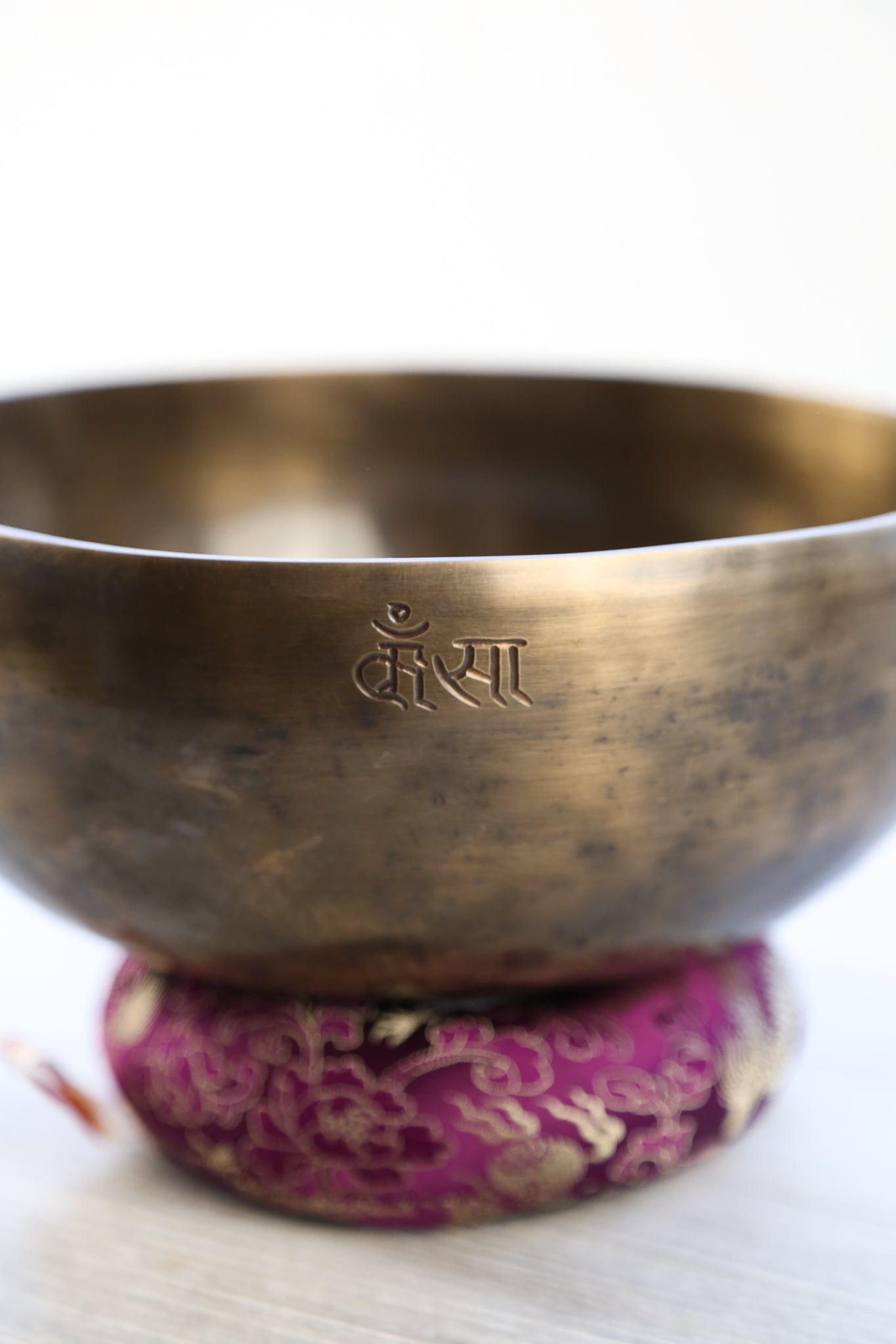 Each bowl features gorgeous hand carved details including an exclusive Full Moon Singing Bowl stamp, an original makers mark, and the mantra of compassion in Tibetan script.