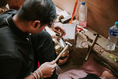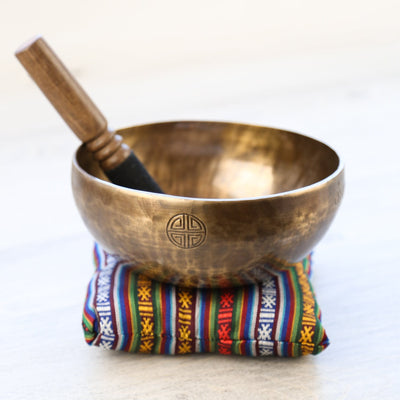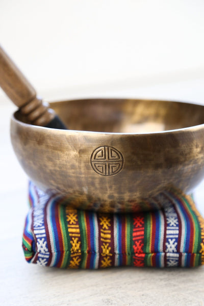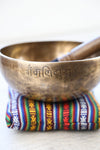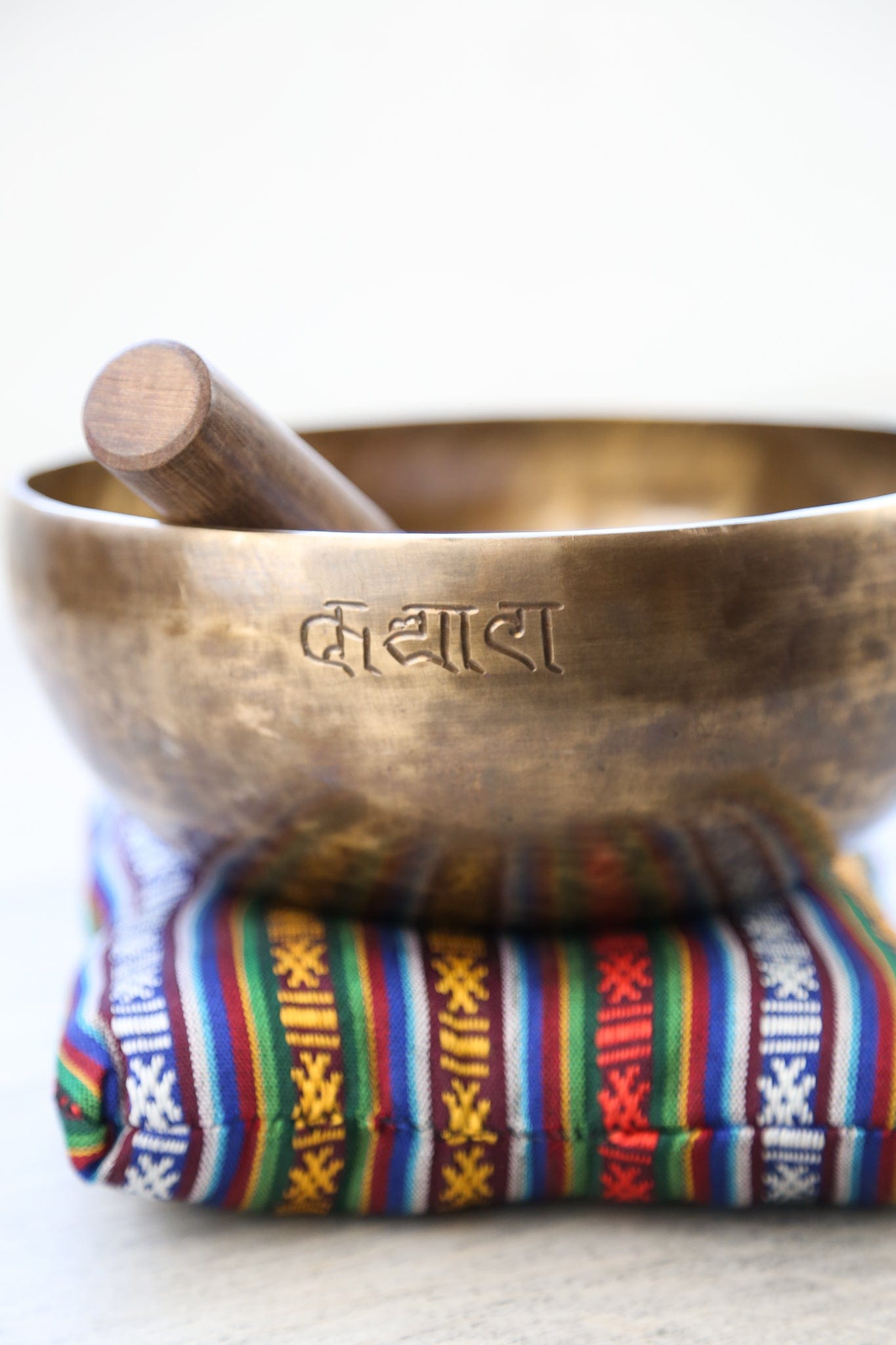 Each bowl features gorgeous hand carved details including an exclusive Full Moon Singing Bowl stamp, an original makers mark, and the mantra of compassion in Tibetan script.