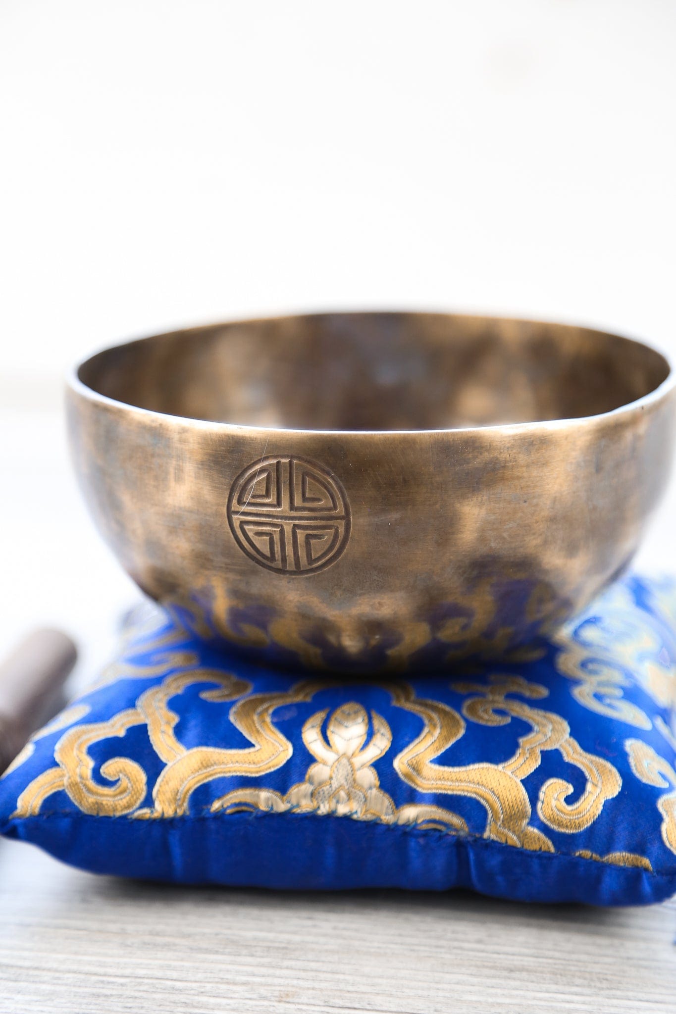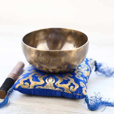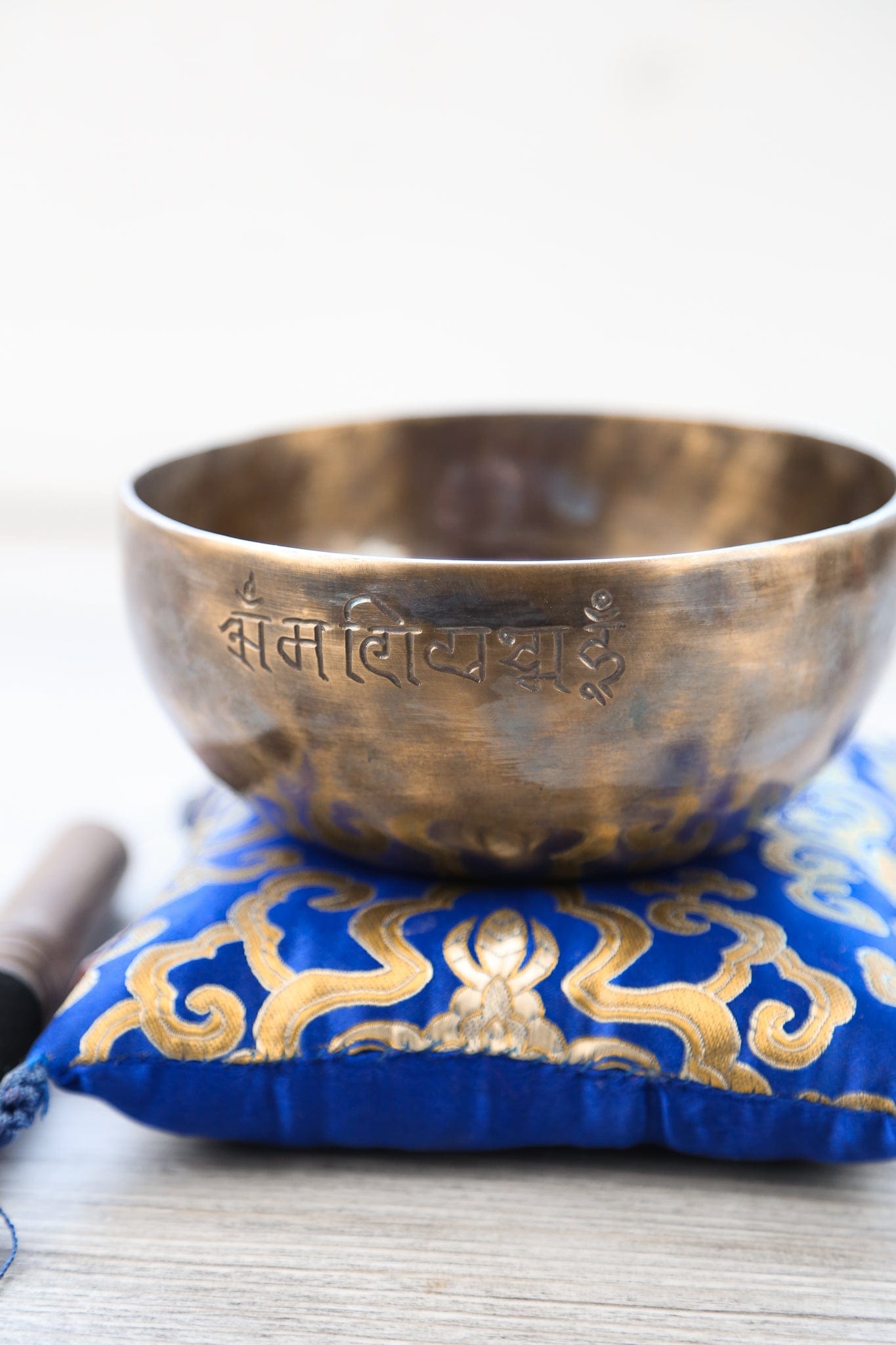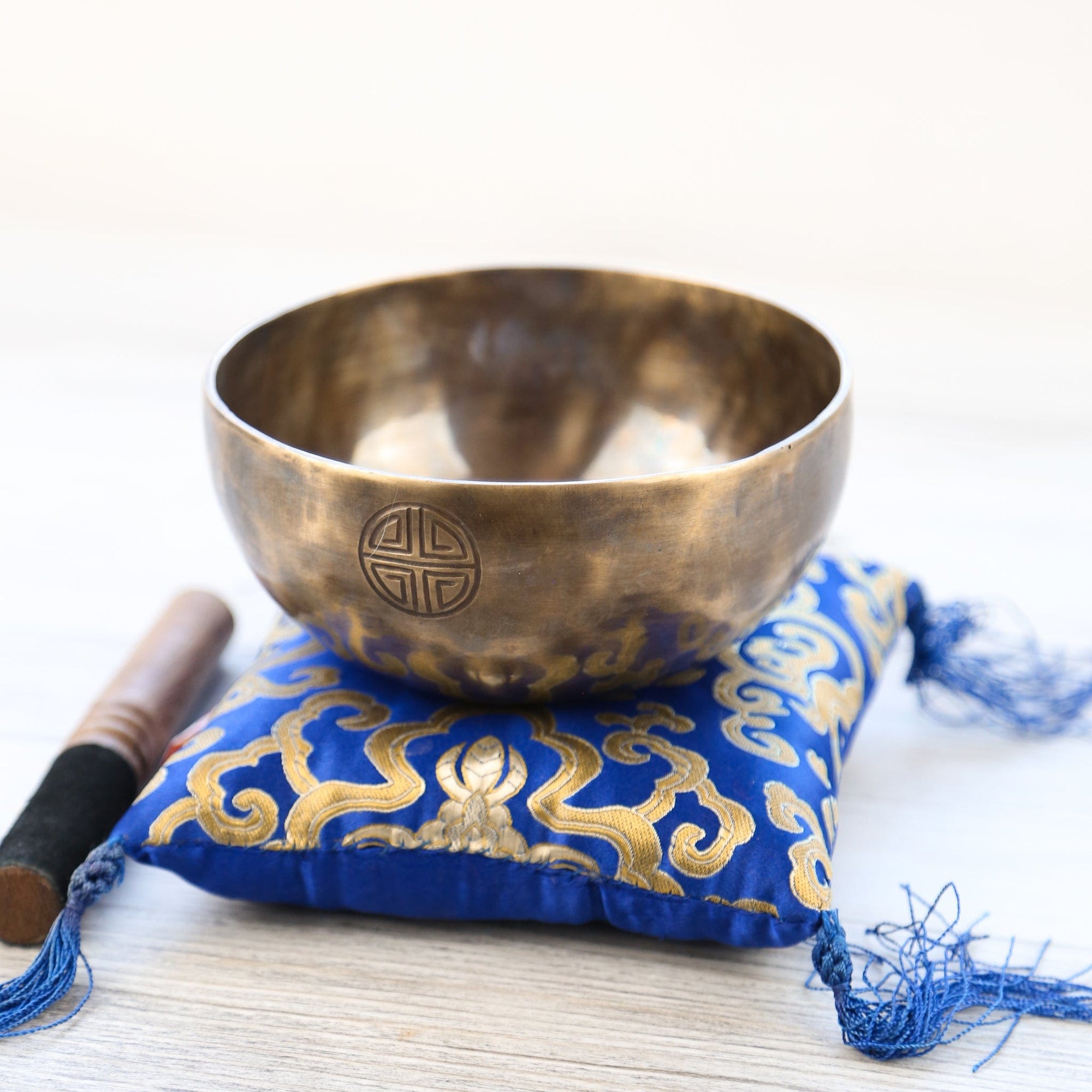 Each bowl features gorgeous hand carved details including an exclusive Full Moon Singing Bowl stamp and the mantra of compassion in Tibetan script.