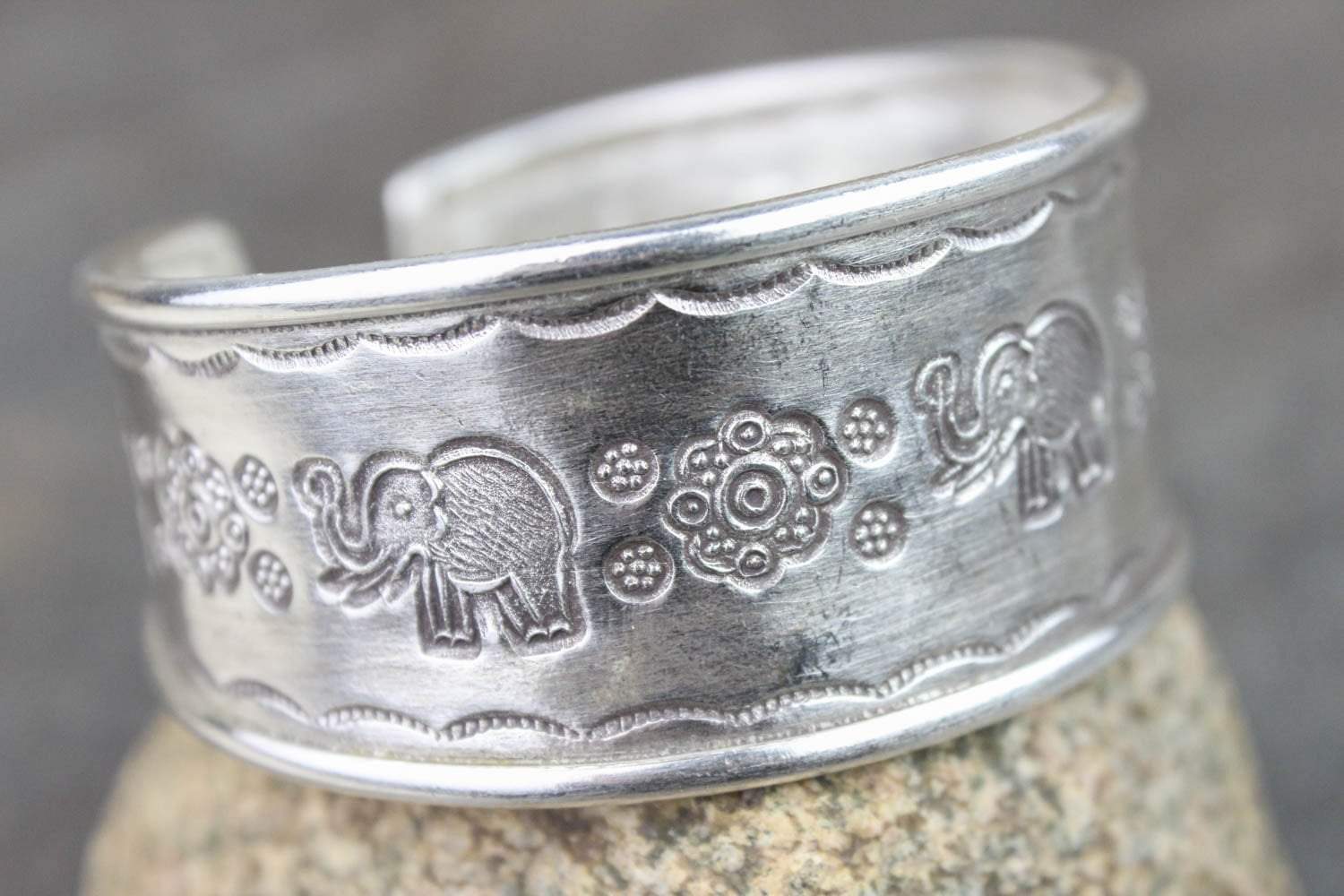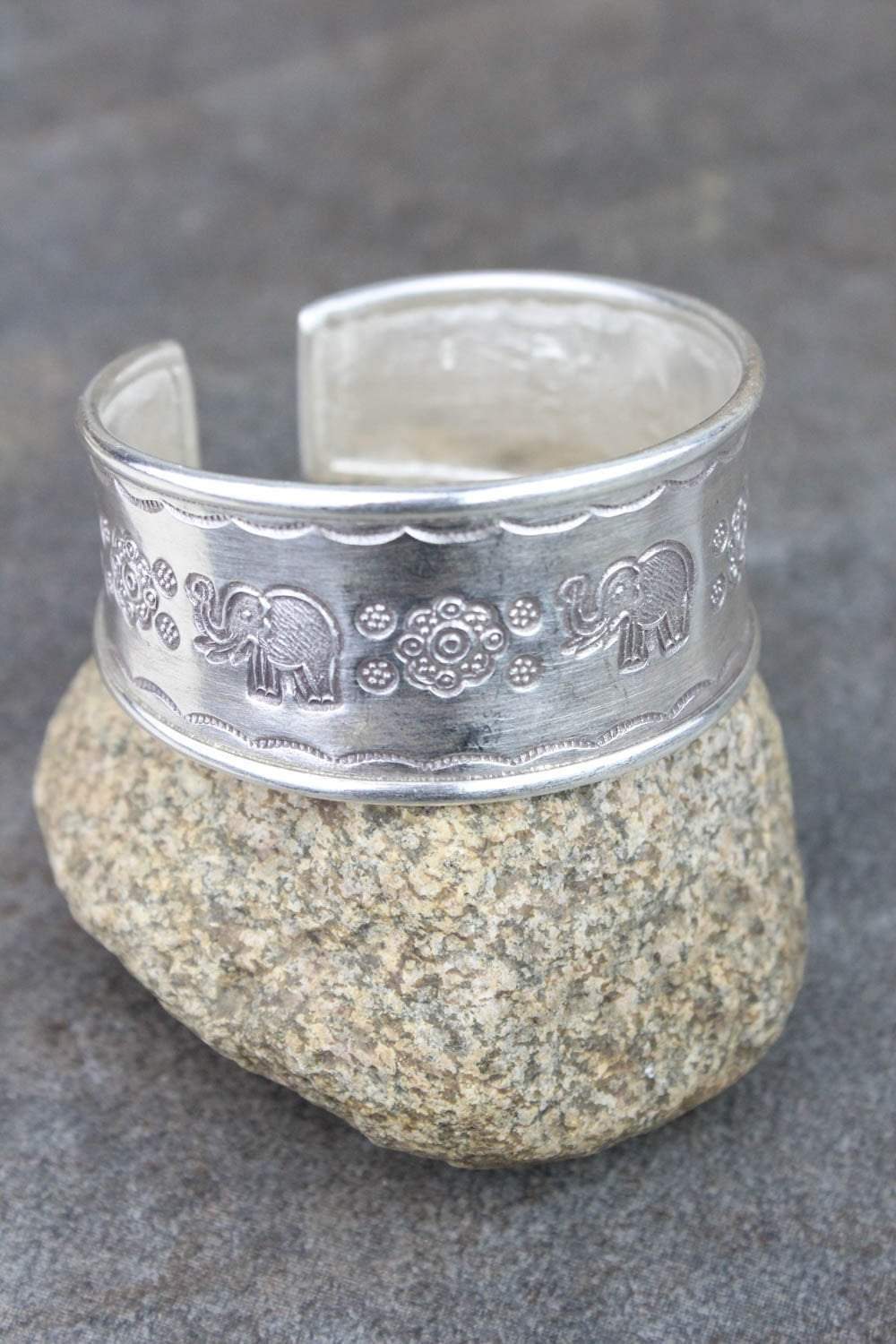 Brazalete de plata pura muy detallado. Brazalete de plata estampado Hill Tribe con una hilera de elefantes rodeados de pájaros.