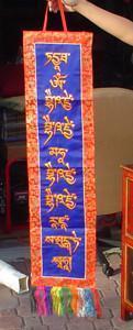 Esta pancarta grande y colorida tiene el mantra del buda de la medicina. El estandarte es una versión corta del Mantra del Buda medicinal: Om namo bhagawate Bhaishjaye guru vaidurya prabha rajaya tathagataya arhate samyaksam buddhaya teyatha om bekhajye bekhajye maha bekhajye bekhajye rajaya samungate svaha. Esto significa: ¡Auspicioso! Me postro ante ti, Rey del lapislázuli, que has conquistado el ciclo de nacimiento, envejecimiento, enfermedad y muerte, que has pasado al estado de los Budas, el médico supremo, que está perfectamente despierto, el Iluminado, el Buda de la Medicina, Rey de todos los médicos.