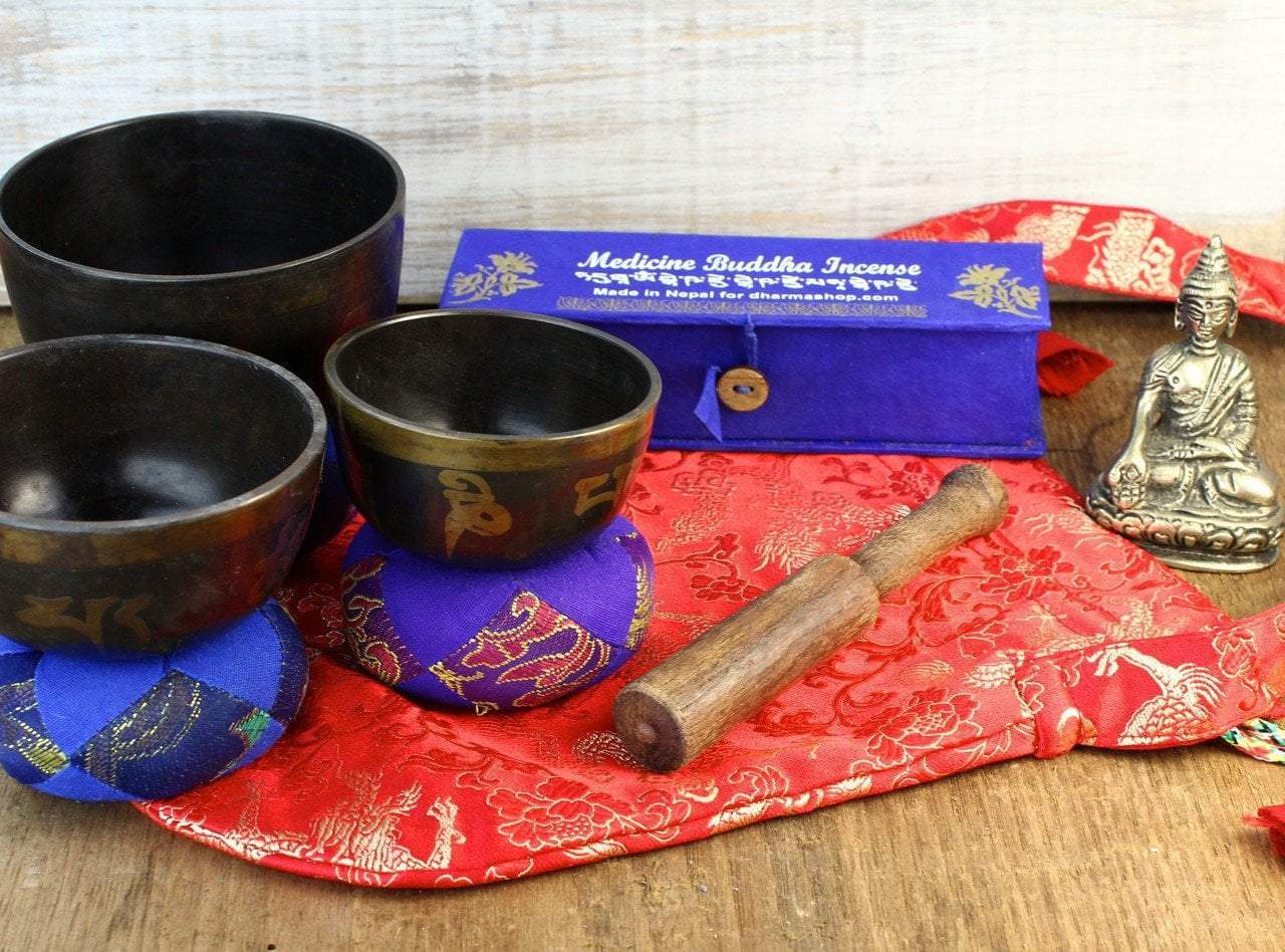Nuestro nuevo set de regalo del Buda de la Medicina incluye una gran bolsa tradicional mala de brocado rojo con correas para viajar, una caja de nuestro Incienso del Buda de la Medicina DharmaShop, una pequeña estatua de Buda y un juego de tres cuencos tibetanos con cojines y un pequeño mazo. Perfecto para un espacio de altar.