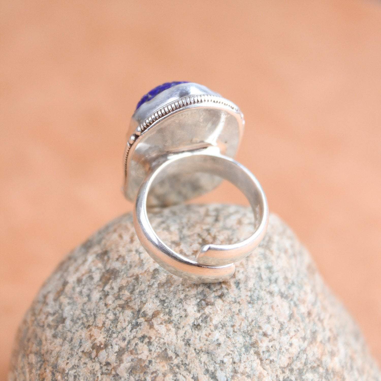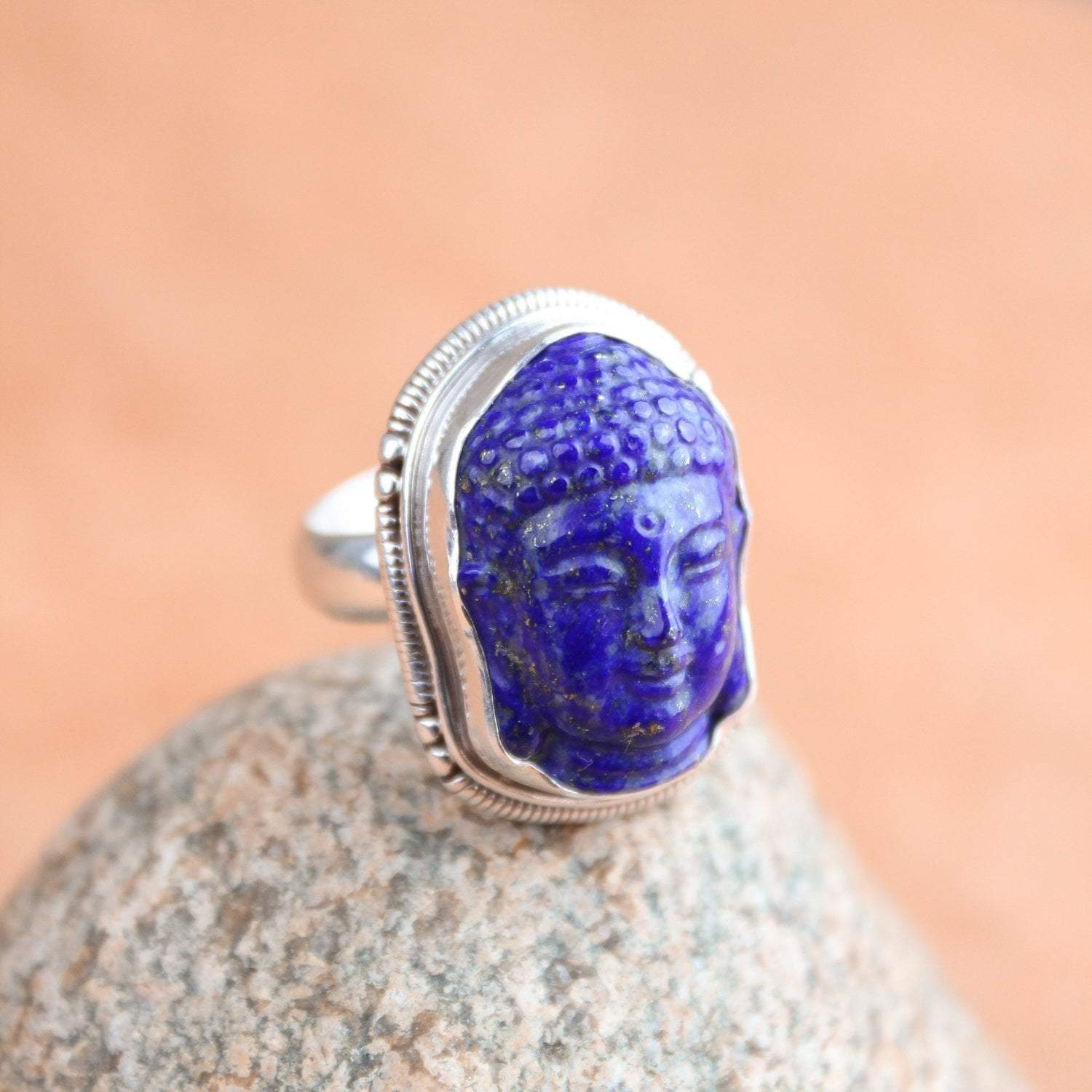 Use este atrevido anillo como recordatorio de los poderes curativos del Buda de la Medicina, como símbolo de su propia práctica o simplemente por su belleza . El anillo presenta una piedra preciosa de lapislázuli tallada a mano engarzada en plata de ley con una banda ajustable.