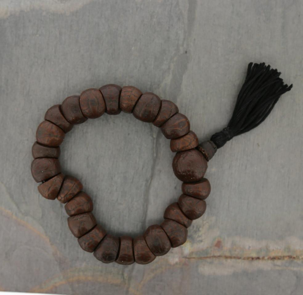 27 cuentas de semillas de bodhi inusuales, además de un gurú, cortadas en ángulos y teñidas de oscuro le dan a esta muñeca mala toneladas de textura y carácter.