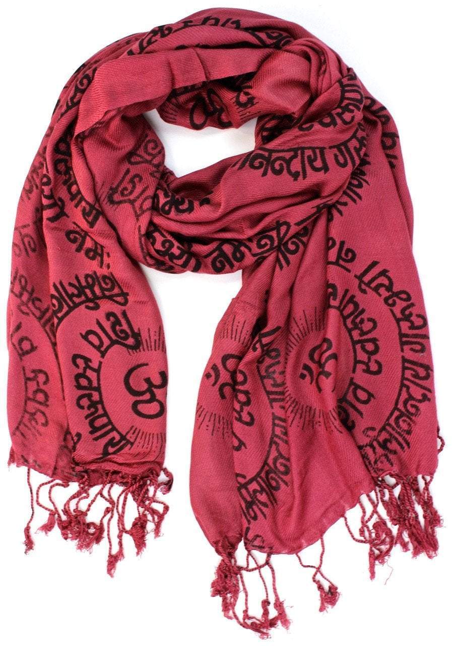 Una bufanda ligera perfecta para la primavera y el verano. Incluye flecos sencillos en los extremos y un nuevo diseño Om rodeado de un mantra tibetano. Hecho a mano en Katmandú, Nepal.