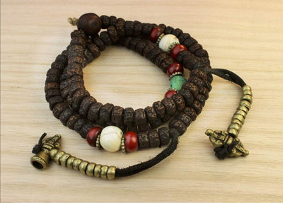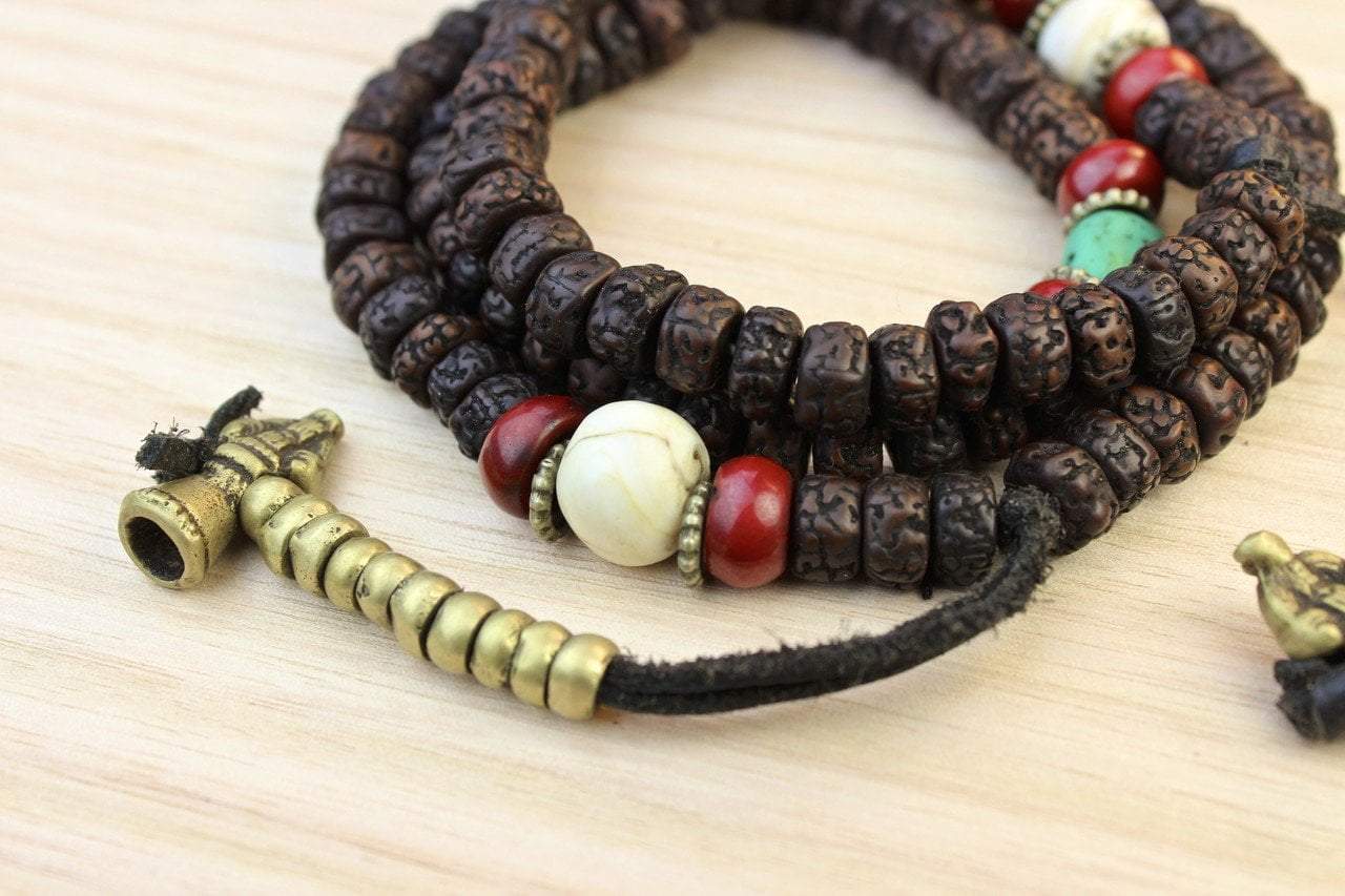 Comprado en la calle en Katmandú, Nepal. Estas cuentas bien utilizadas son una rudraksha oscura con espaciadores de naga, piedra y copal. La cuenta del gurú es una gran semilla bodhi. Mostradores sobre cuero.