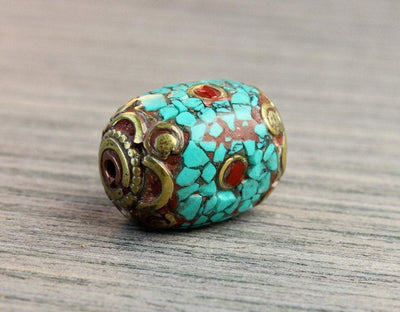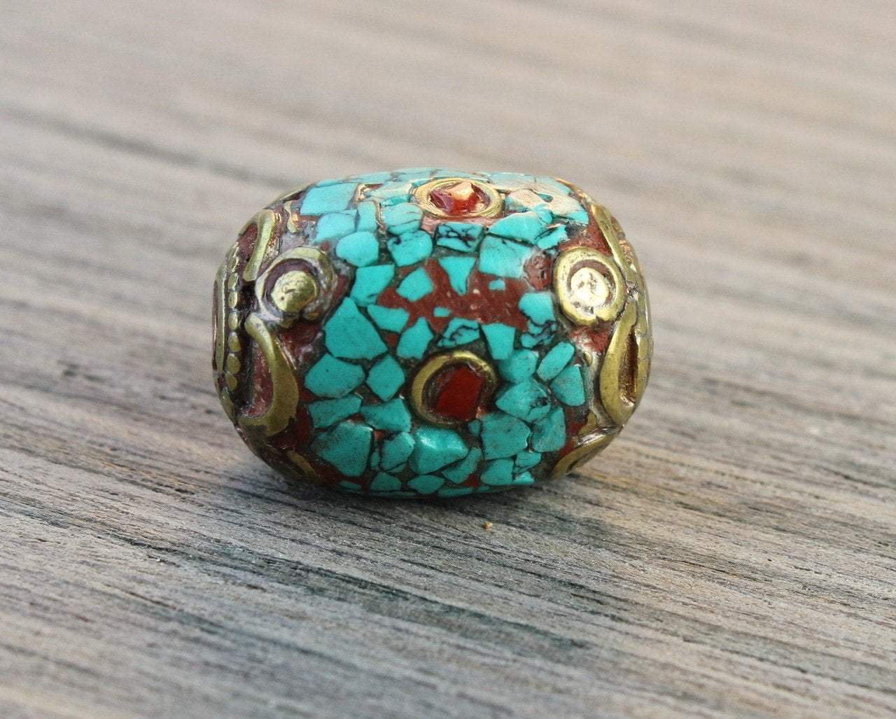 Una pequeña cuenta tibetana tradicional con latón y coral sobre una piedra turquesa. Sería una buena adición a cualquier mala, pulsera o collar.