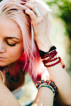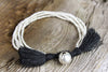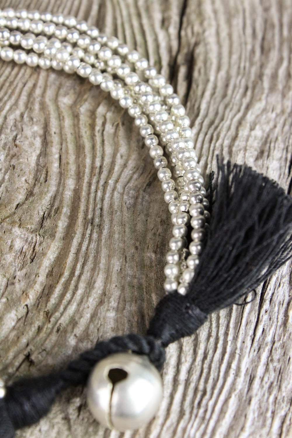 La nueva pulsera de metal blanco de varias hebras incluye seis hebras de cuentas plateadas y dos borlas negras de 1 pulgada. La tradicional campana tibetana actúa como cierre de la pulsera. Este diseño sencillo y femenino queda genial solo o combinado con otras joyas.