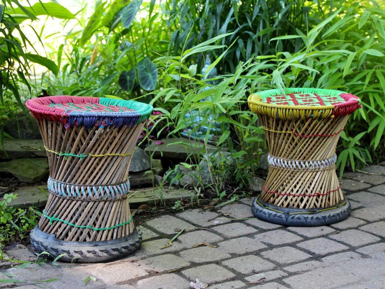 Taburetes tejidos a mano en Nepal. Para todo tipo de clima, extremadamente duradero, cómodo y duradero. La parte inferior está hecha de un neumático de moto reciclado.