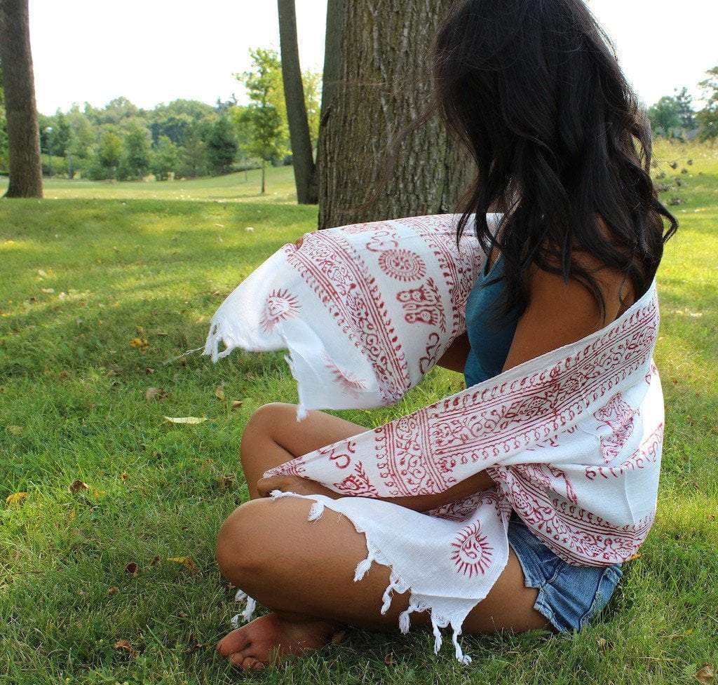 Hecho a mano en Katmandú, Nepal. 18 por 72 pulgadas. 100% algodón. Algodón súper suave, fino y de peso veraniego. Teñido vegetal con diseños OM impresos a mano.