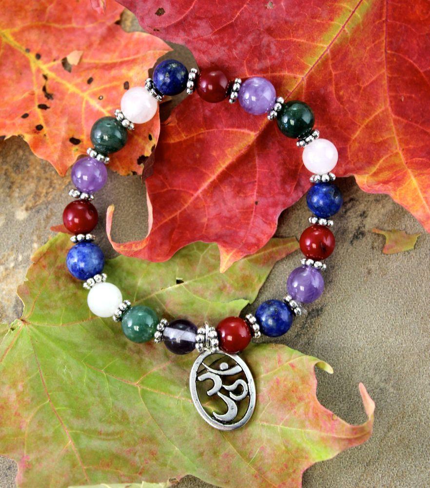 Cuentas de lapislázuli, jaspe rojo, amatista, cuarzo nieve y aventurina engarzadas en un elástico para una mayor duración y un uso fácil de poner y quitar.